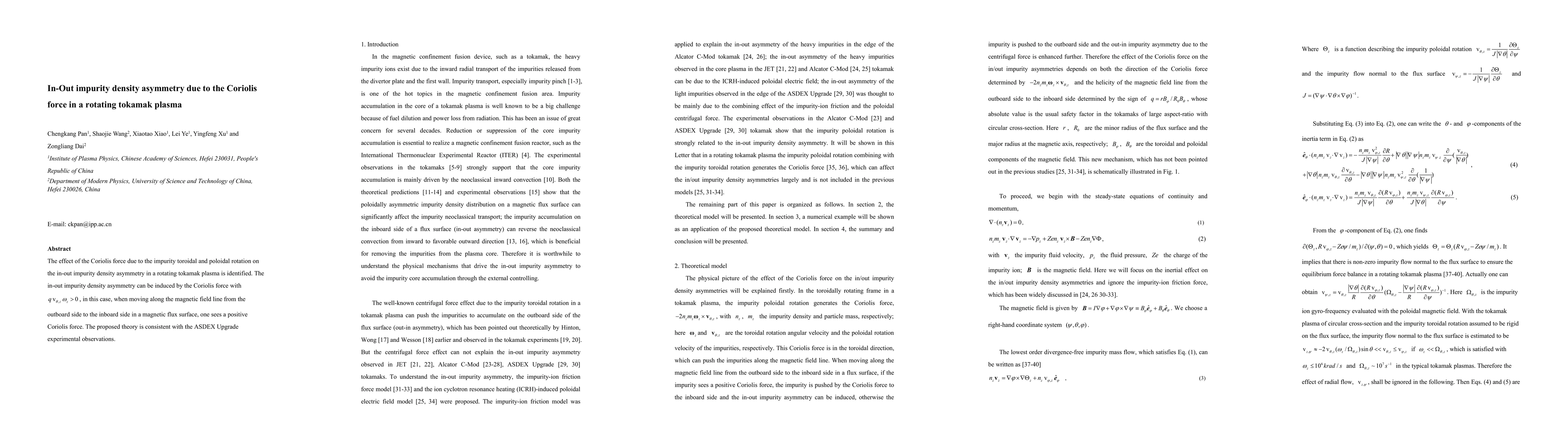 The study identifies the Coriolis force's impact on in-out impurity density asymmetry in rotating tokamak plasma, showing a positive force effect when moving from outboard to inboard. The theoretical findings align with experimental observations from ASDEX Upgrade.