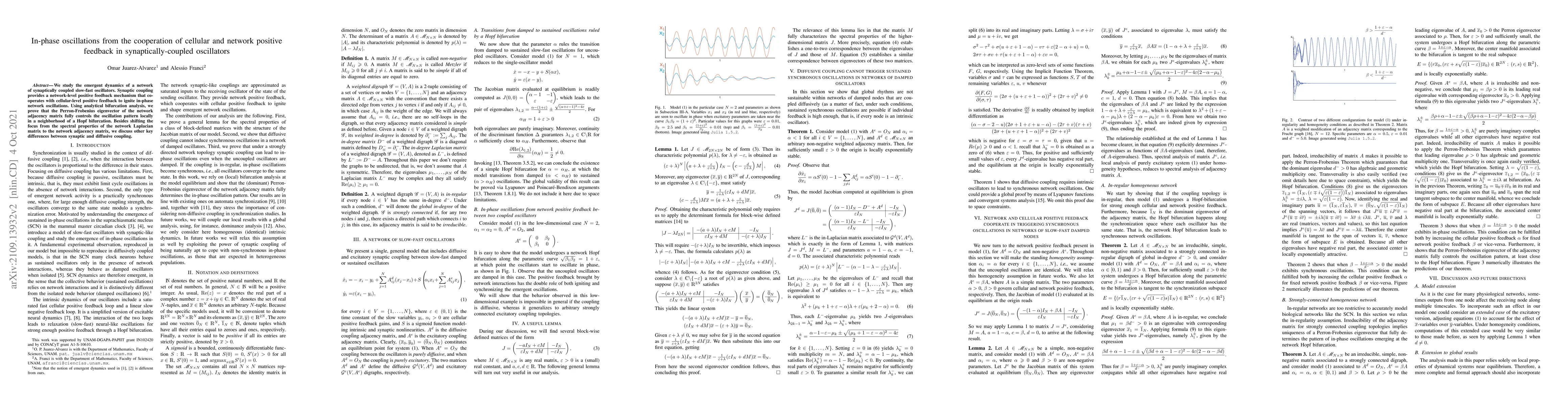 We study the emergent dynamics of a network of synaptically coupled slow-fast oscillators. Synaptic coupling provides a network-level positive feedback mechanism that cooperates with cellular-level positive feedback to ignite in-phase network oscillations. Using analytical bifurcation analysis, we prove that the Perron-Frobenius eigenvector of the network adjacency matrix fully controls the oscillation pattern locally in a neighborhood of a Hopf bifurcation. Besides shifting the focus from the spectral properties of the network Laplacian matrix to the network adjacency matrix, we discuss other key differences between synaptic and diffusive coupling.