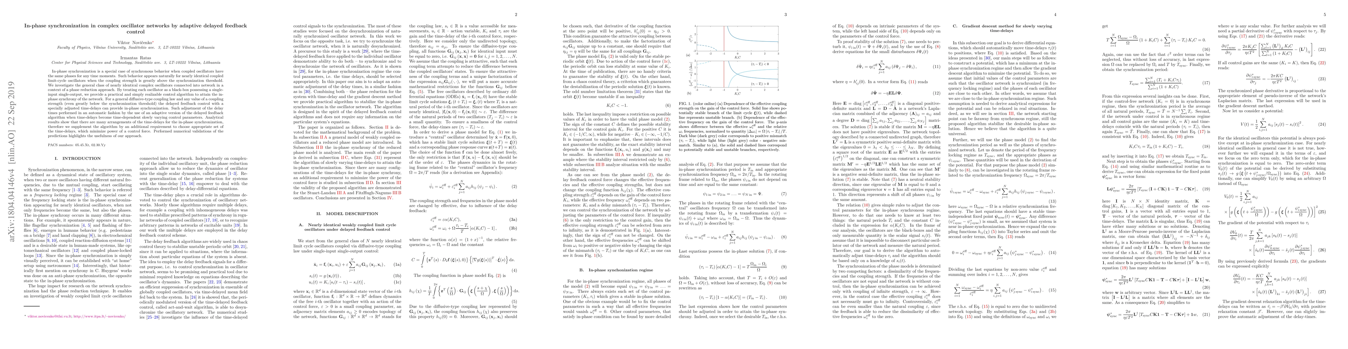 In-phase synchronization is a special case of synchronous behavior when coupled oscillators have the same phases for any time moments. Such behavior appears naturally for nearly identical coupled limit-cycle oscillators when the coupling strength is greatly above the synchronization threshold. We investigate the general class of nearly identical complex oscillators connected into network in a context of a phase reduction approach. By treating each oscillator as a black-box possessing a single-input single-output, we provide a practical and simply realizable control algorithm to attain the in-phase synchrony of the network. For a general diffusive-type coupling law and any value of a coupling strength (even greatly below the synchronization threshold) the delayed feedback control with a specially adjusted time-delays can provide in-phase synchronization. Such adjustment of the delay times performed in an automatic fashion by the use of an adaptive version of the delayed feedback algorithm when time-delays become time-dependent slowly varying control parameters. Analytical results show that there are many arrangements of the time-delays for the in-phase synchronization, therefore we supplement the algorithm by an additional requirement to choose appropriate set of the time-delays, which minimize power of a control force. Performed numerical validations of the predictions highlights the usefulness of our approach.