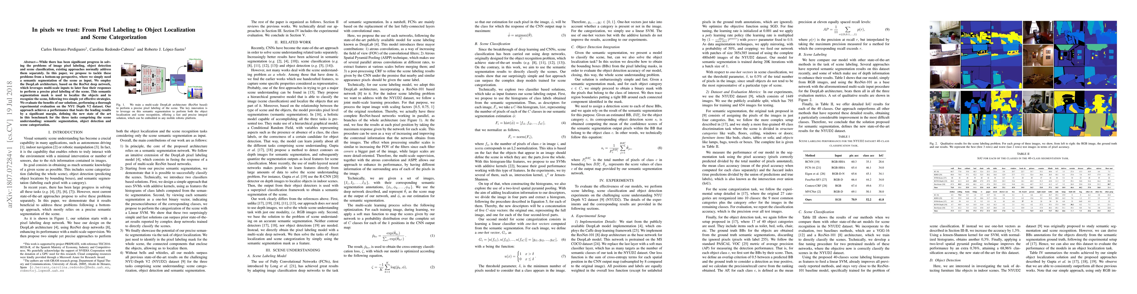 This paper proposes a unified approach for pixel labeling, object localization, and scene categorization using a bottom-up strategy based on semantic segmentation with DeepLab and ResNet. The method achieves superior performance on the NYU Depth V2 dataset, setting a new state-of-the-art for these tasks.