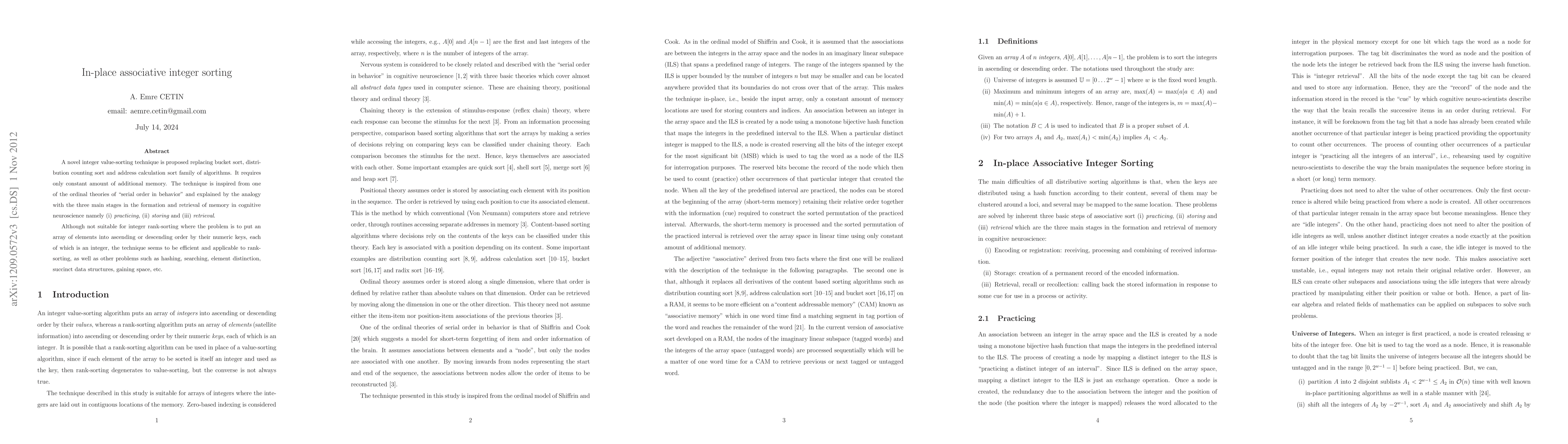 This paper proposes a novel in-place associative integer sorting technique that replaces traditional bucket, distribution counting, and address calculation sorts, requiring only constant additional memory. It is inspired by cognitive neuroscience stages of practicing, storing, and retrieval, and is efficient for rank-sorting and applicable to hashing, searching, and succinct data structures.