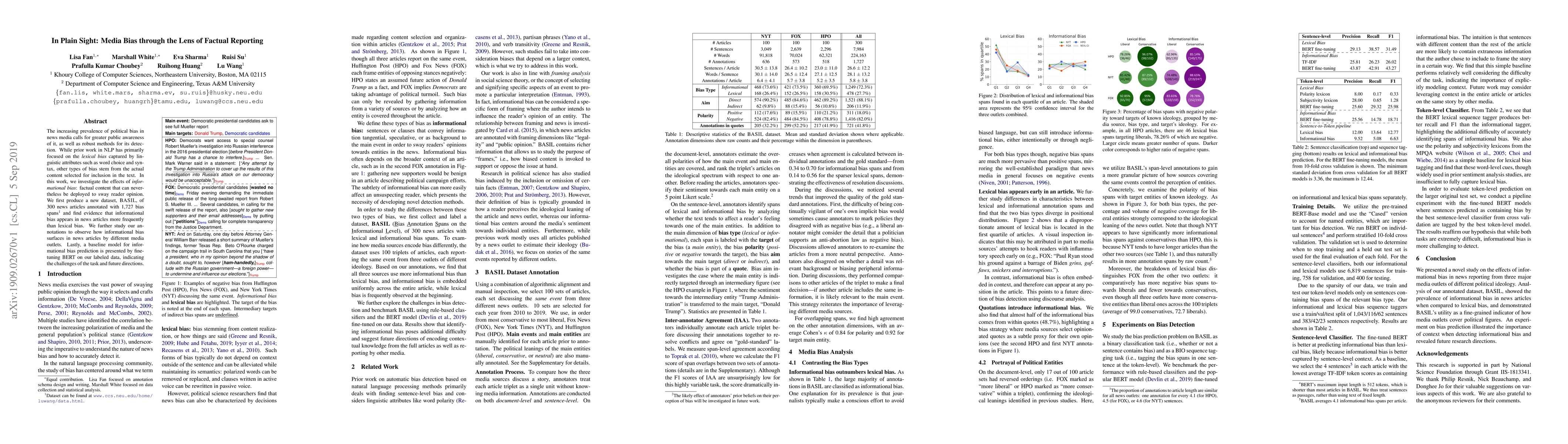 The increasing prevalence of political bias in news media calls for greater public awareness of it, as well as robust methods for its detection. While prior work in NLP has primarily focused on the lexical bias captured by linguistic attributes such as word choice and syntax, other types of bias stem from the actual content selected for inclusion in the text. In this work, we investigate the effects of informational bias: factual content that can nevertheless be deployed to sway reader opinion. We first produce a new dataset, BASIL, of 300 news articles annotated with 1,727 bias spans and find evidence that informational bias appears in news articles more frequently than lexical bias. We further study our annotations to observe how informational bias surfaces in news articles by different media outlets. Lastly, a baseline model for informational bias prediction is presented by fine-tuning BERT on our labeled data, indicating the challenges of the task and future directions.