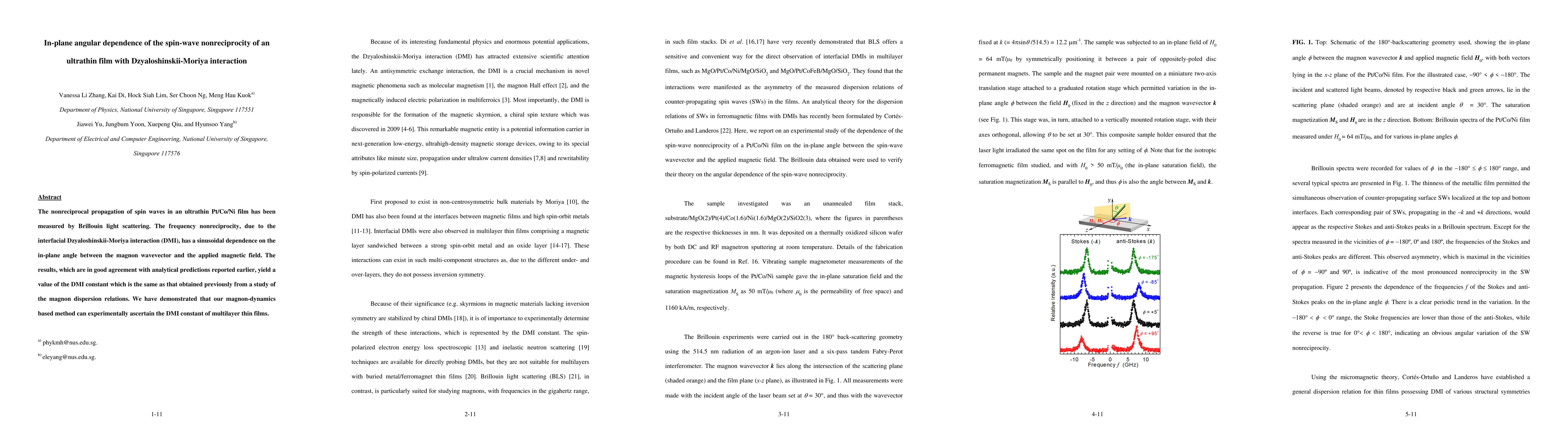 This paper measures the nonreciprocal propagation of spin waves in an ultrathin Pt/Co/Ni film using Brillouin light scattering, finding a sinusoidal in-plane angular dependence due to Dzyaloshinskii-Moriya interaction. The study confirms analytical predictions and demonstrates a method to ascertain the Dzyaloshinskii-Moriya interaction constant from magnon dynamics.
