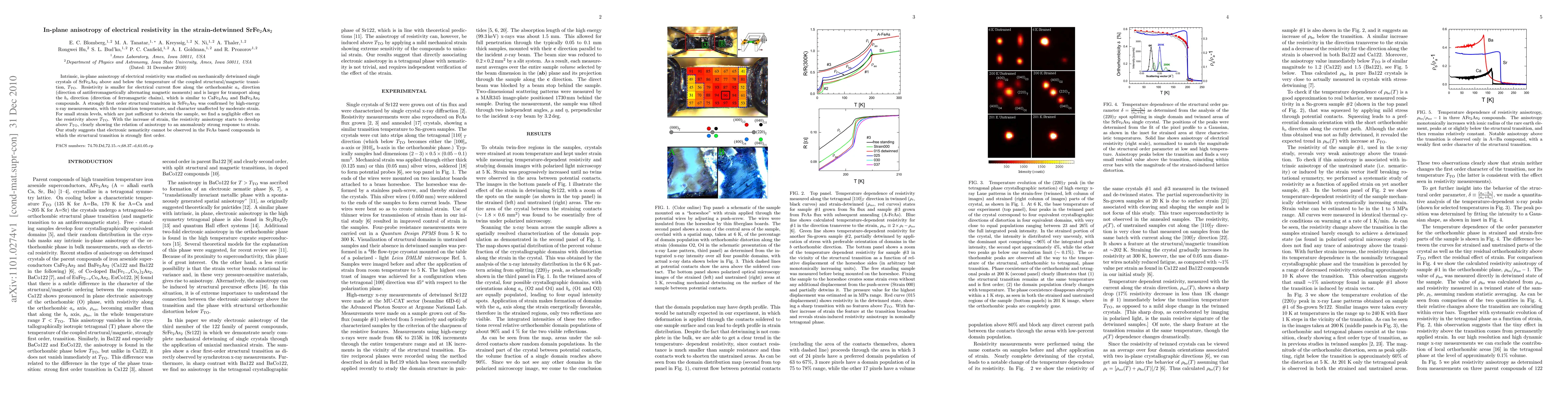 Intrinsic, in-plane anisotropy of electrical resistivity was studied on mechanically detwinned single crystals of SrFe$_2$As$_2$ above and below the temperature of the coupled structural/magnetic transition, $T_{\textrm{TO}}$. Resistivity is smaller for electrical current flow along the orthorhombic $a_o$ direction (direction of antiferromagnetically alternating magnetic moments) and is larger for transport along the $b_o$ direction (direction of ferromagnetic chains), which is similar to CaFe$_2$As$_2$ and BaFe$_2$As$_2$ compounds. A strongly first order structural transition in SrFe$_2$As$_2$ was confirmed by high-energy x-ray measurements, with the transition temperature, and character unaffected by moderate strain. For small strain levels, which are just sufficient to detwin the sample, we find a negligible effect on the resistivity above $T_{\textrm{TO}}$. With the increase of strain, the resistivity anisotropy starts to develop above $T_{\textrm{TO}}$, clearly showing the relation of anisotropy to an anomalously strong response to strain. Our study suggests that electronic nematicity cannot be observed in the FeAs based compounds in which the structural transition is strongly first order.