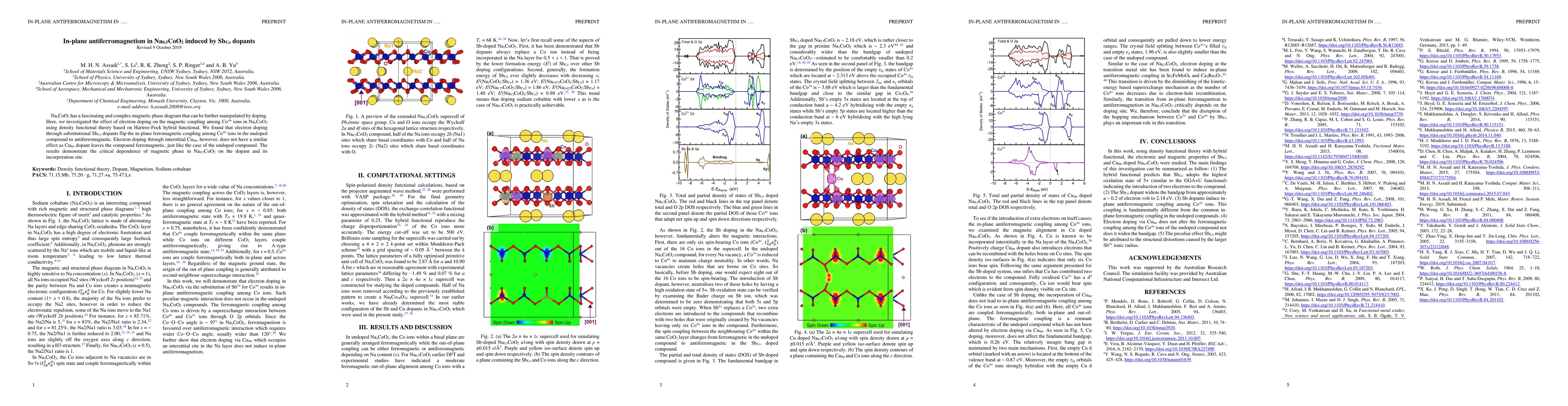 This paper investigates how electron doping via $Sb_{Co}$ dopants in $Na_{0.5}CoO_2$ induces a transition from in-plane ferromagnetic to antiferromagnetic coupling among $Co^{4+}$ ions, contrasting with the non-altering effect of interstitial $Cu_{Int}$ dopants. The study highlights the significance of dopant type and site for magnetic phase manipulation.