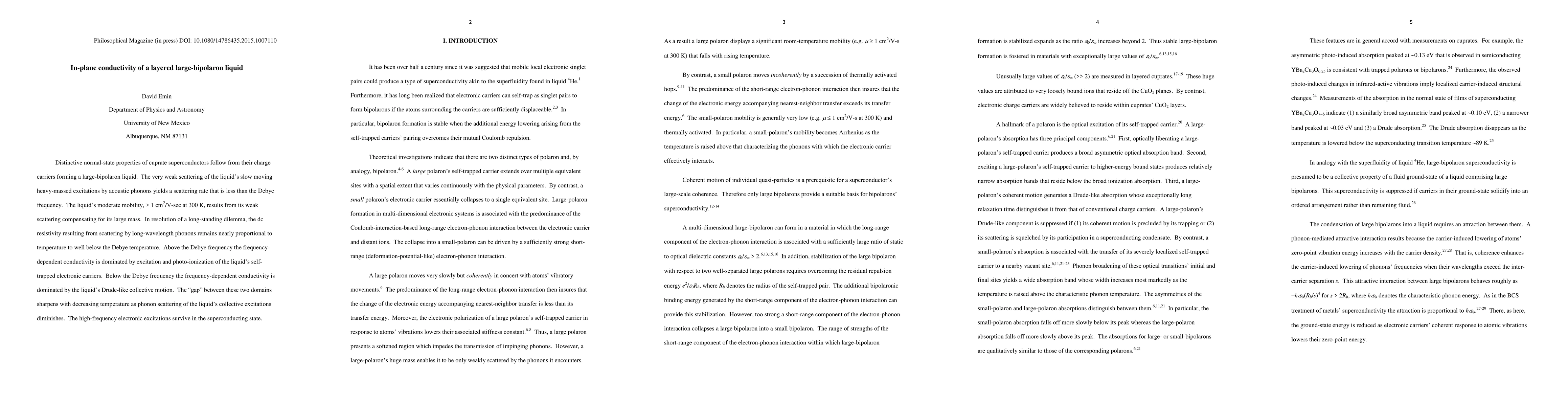 The paper proposes that cuprate superconductors' unique properties stem from charge carriers forming a large-bipolaron liquid. This liquid exhibits weak scattering by acoustic phonons, leading to a temperature-proportional dc resistivity even below the Debye temperature. The conductivity below and above the Debye frequency is influenced by different mechanisms, with high-frequency electronic excitations persisting in the superconducting state.