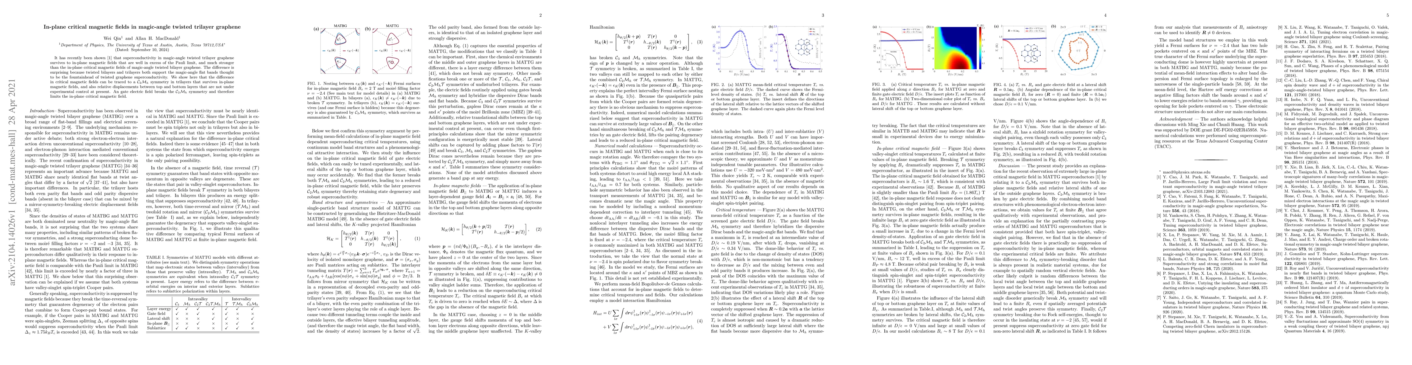 It has recently been shown that superconductivity in magic-angle twisted trilayer graphene survives to in-plane magnetic fields that are well in excess of the Pauli limit, and much stronger than the in-plane critical magnetic fields of magic-angle twisted bilayer graphene. The difference is surprising because twisted bilayers and trilayers both support the magic-angle flat bands thought to be the fountainhead of twisted graphene superconductivity. We show here that the difference in critical magnetic fields can be traced to a $\mathcal{C}_2 \mathcal{M}_{h}$ symmetry in trilayers that survives in-plane magnetic fields, and also relative displacements between top and bottom layers that are not under experimental control at present. An gate electric field breaks the $\mathcal{C}_2 \mathcal{M}_{h}$ symmetry and therefore limits the in-plane critical magnetic field.