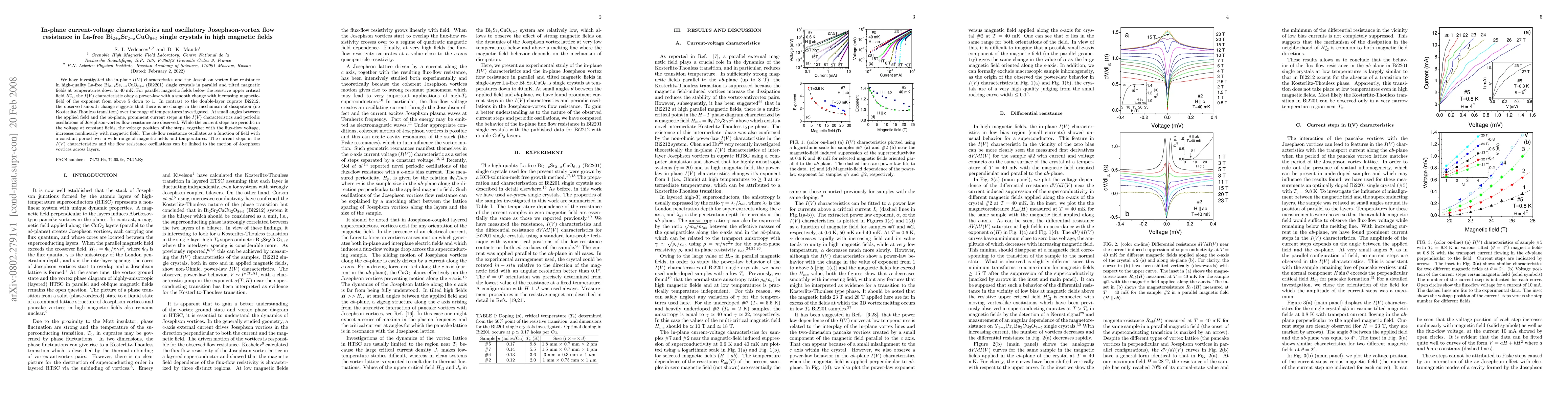 This study investigates the in-plane current-voltage characteristics and Josephson vortex flow resistance in La-free Bi$_{2+x}$Sr$_{2-x}$CuO$_{6+\delta}$ single crystals under high magnetic fields. The observed smooth power-law change in $I(V)$ characteristics suggests no Kosterlitz-Thouless transition, while current steps and oscillatory resistance in tilted fields indicate vortex motion across layers.