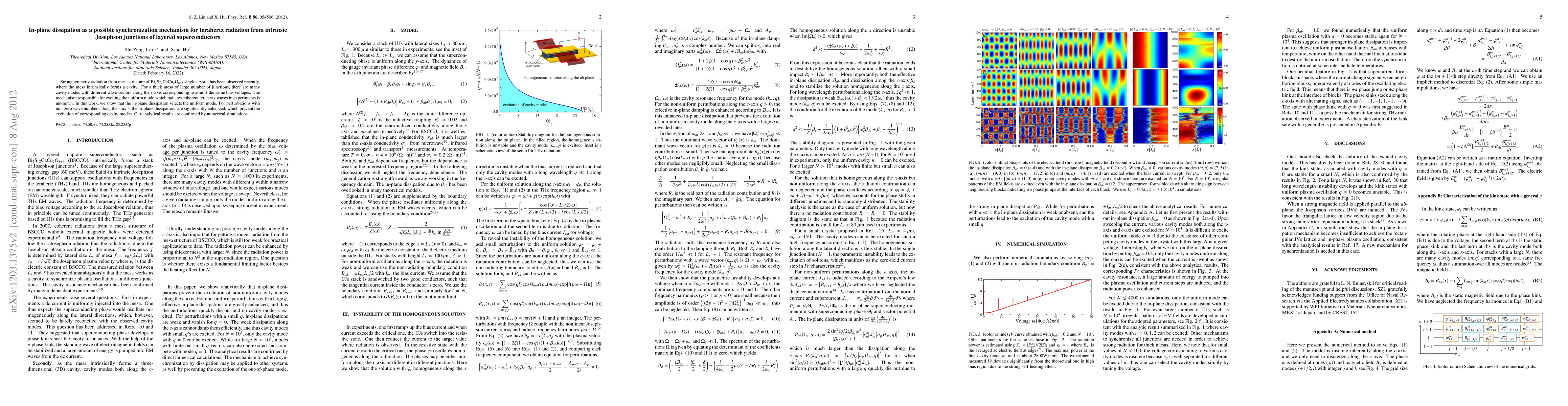 Strong terahertz radiation from mesa structure of $\rm{Bi_2Sr_2CaCu_2O_{8+\delta}}$ single crystal has been observed recently, where the mesa intrinsically forms a cavity. For a thick mesa of large number of junctions, there are many cavity modes with different wave vectors along the c-axis corresponding to almost degenerate bias voltages. The mechanism responsible for exciting the uniform mode which radiates coherent terahertz waves in experiments is unknown. In this work, we show that the in-plane dissipation selects the uniform mode. For perturbations with non-zero wave numbers along the c-axis, the in-plane dissipations are significantly enhanced, which prevent the excitation of corresponding cavity modes. Our analytical results are confirmed by numerical simulations.