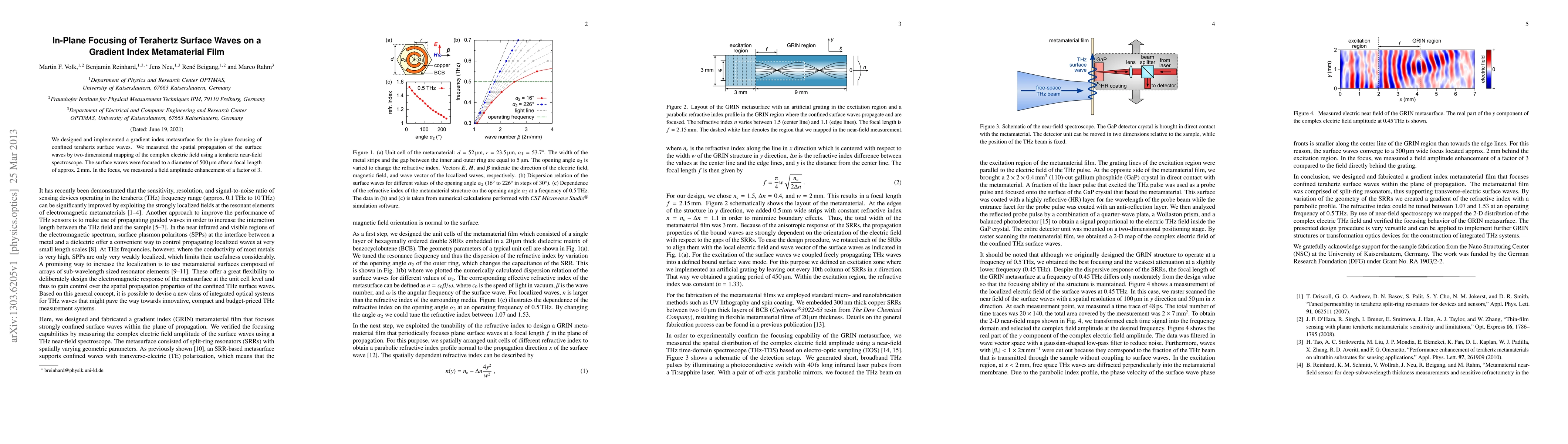 We designed and implemented a gradient index metasurface for the in-plane focusing of confined terahertz surface waves. We measured the spatial propagation of the surface waves by two-dimensional mapping of the complex electric field using a terahertz near-field spectroscope. The surface waves were focused to a diameter of 500 \micro m after a focal length of approx. 2 mm. In the focus, we measured a field amplitude enhancement of a factor of 3.