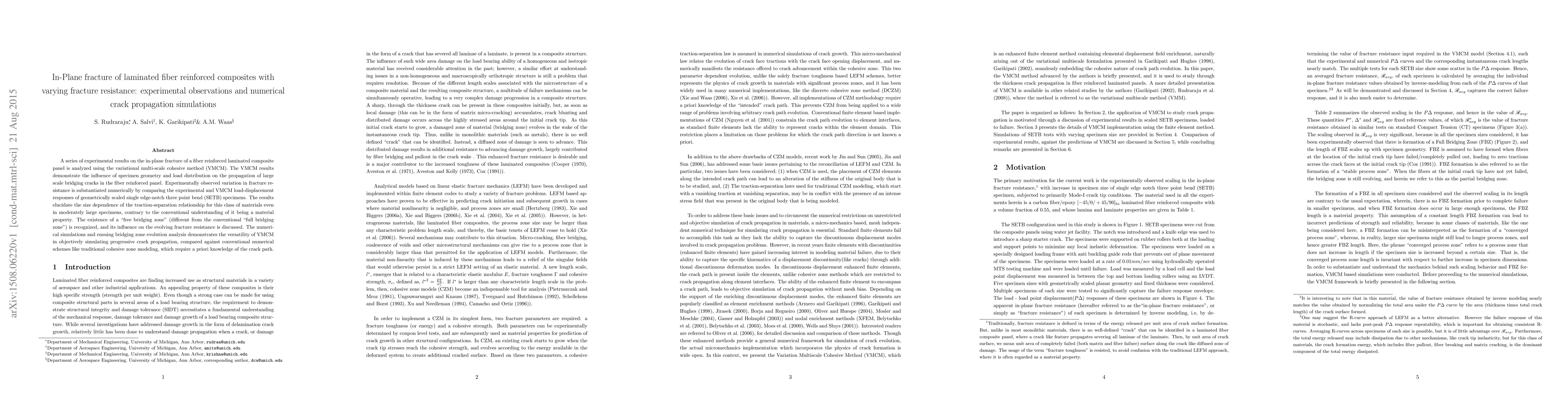 This paper investigates the in-plane fracture behavior of laminated fiber-reinforced composites through experimental and numerical simulations using the VMCM. The study reveals the size dependence of fracture resistance and the existence of a "free bridging zone," highlighting the method's effectiveness in simulating crack propagation without predefined crack paths.