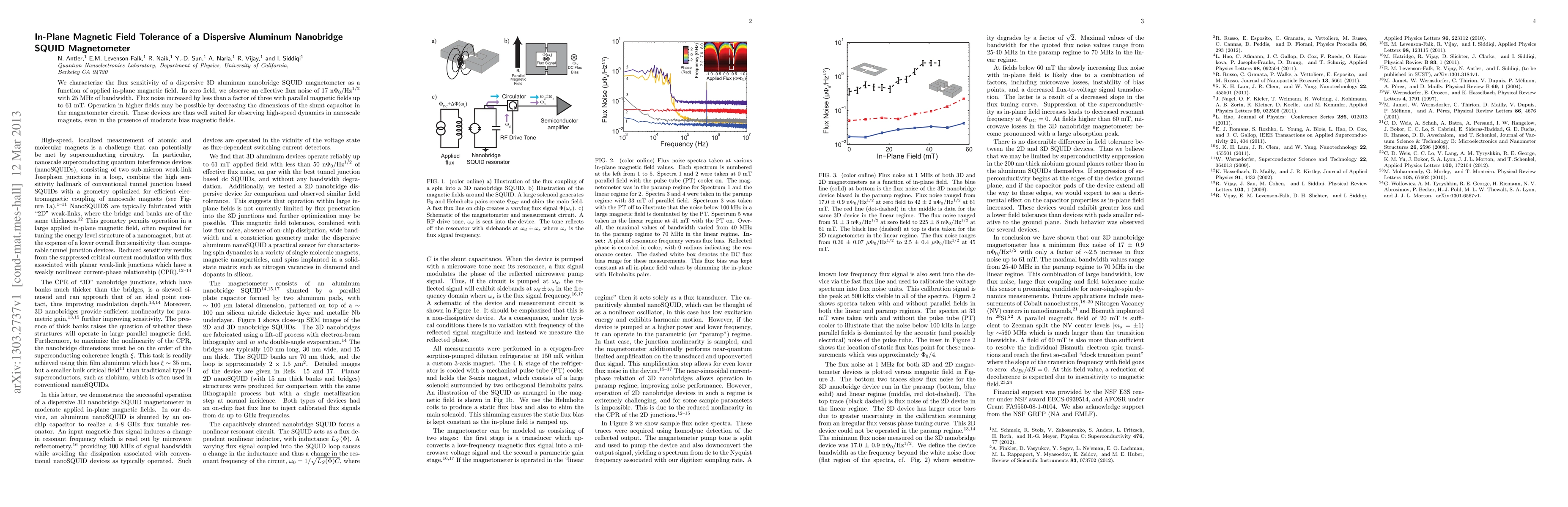 This paper investigates the flux sensitivity of a dispersive aluminum nanobridge SQUID magnetometer under in-plane magnetic fields, finding minimal flux noise increase up to 61 mT, indicating its suitability for high-speed nanoscale magnet dynamics despite moderate bias fields. Potential for higher field operation exists by reducing the shunt capacitor dimensions.