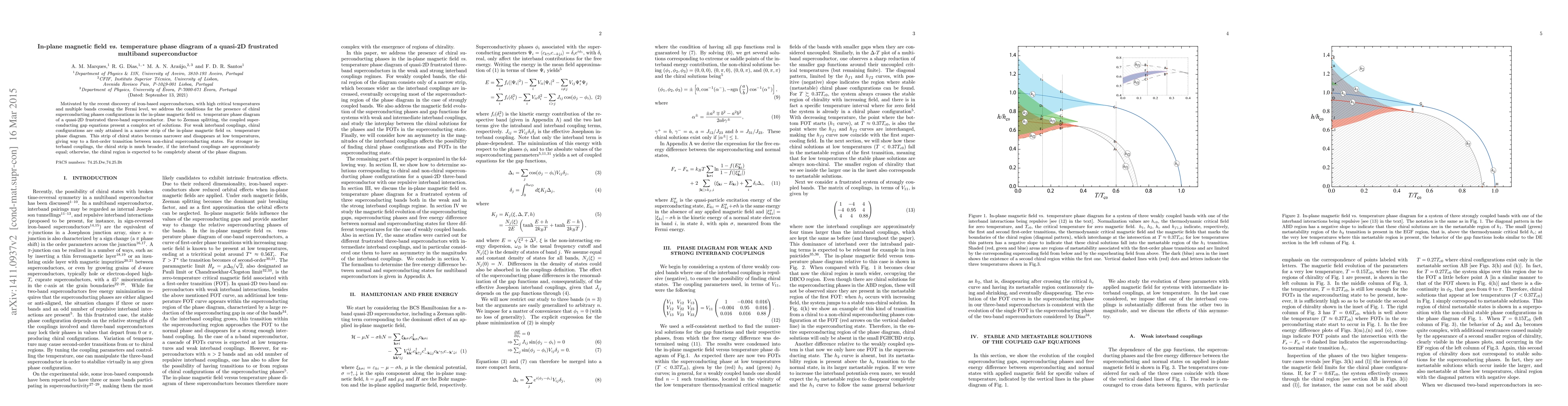This paper investigates the phase diagram of a quasi-2D frustrated multiband superconductor under in-plane magnetic fields and temperature, revealing that chiral superconducting phases occur in narrow regions dependent on interband coupling strength. At low temperatures, a transition to non-chiral states occurs, with broader chiral regions for balanced interband couplings.