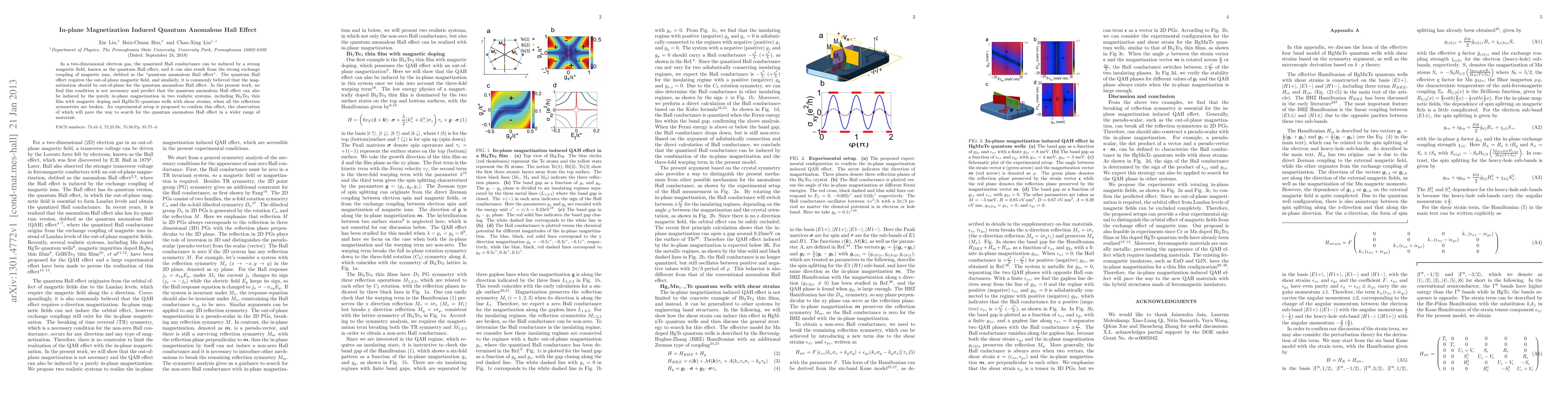 In a two-dimensional electron gas, the quantized Hall conductance can be induced by a strong magnetic field, known as the quantum Hall effect, and it can also result from the strong exchange coupling of magnetic ions, dubbed as the "quantum anomalous Hall effect". The quantum Hall effect requires the out-of-plane magnetic field, and similarly, it is commonly believed that the magnetization should be out-of-plane for the quantum anomalous Hall effect. In the present work, we find this condition is not necessary and predict that the quantum anomalous Hall effect can also be induced by the purely in-plane magnetization in two realistic systems, including Bi$_2$Te$_3$ thin film with magnetic doping and HgMnTe quantum wells with shear strains, when all the reflection symmetries are broken. An experimental setup is proposed to confirm this effect, the observation of which will pave the way to search for the quantum anomalous Hall effect in a wider range of materials.