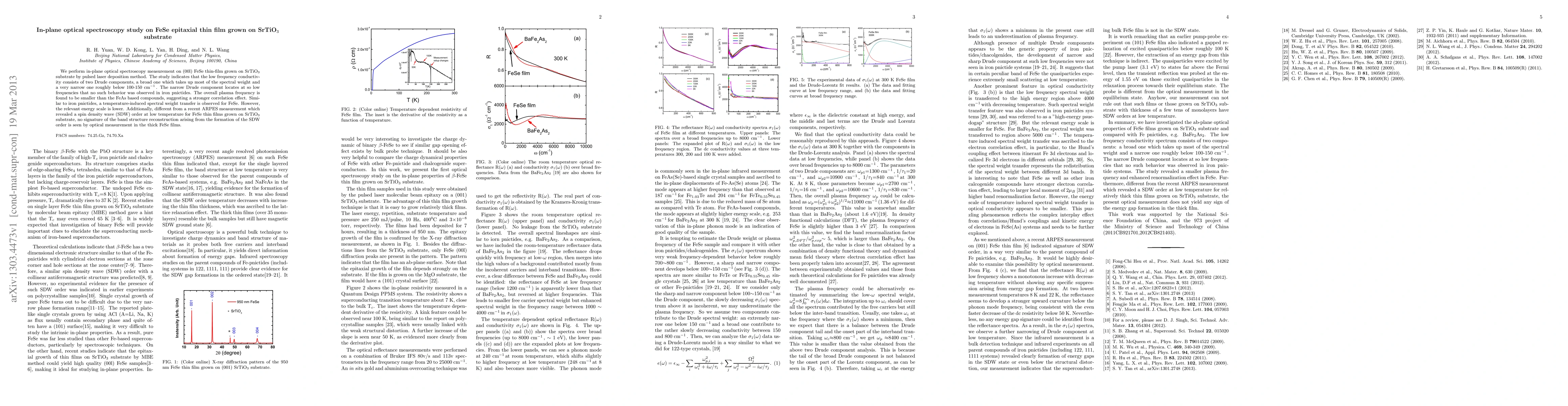 This study employs in-plane optical spectroscopy to investigate FeSe thin films on SrTiO$_3$ substrates, revealing a low-frequency conductivity with two Drude components and a temperature-induced spectral weight transfer, suggesting stronger correlation effects than in FeAs compounds. Despite previous ARPES findings of spin density wave order, optical measurements show no band structure reconstruction.