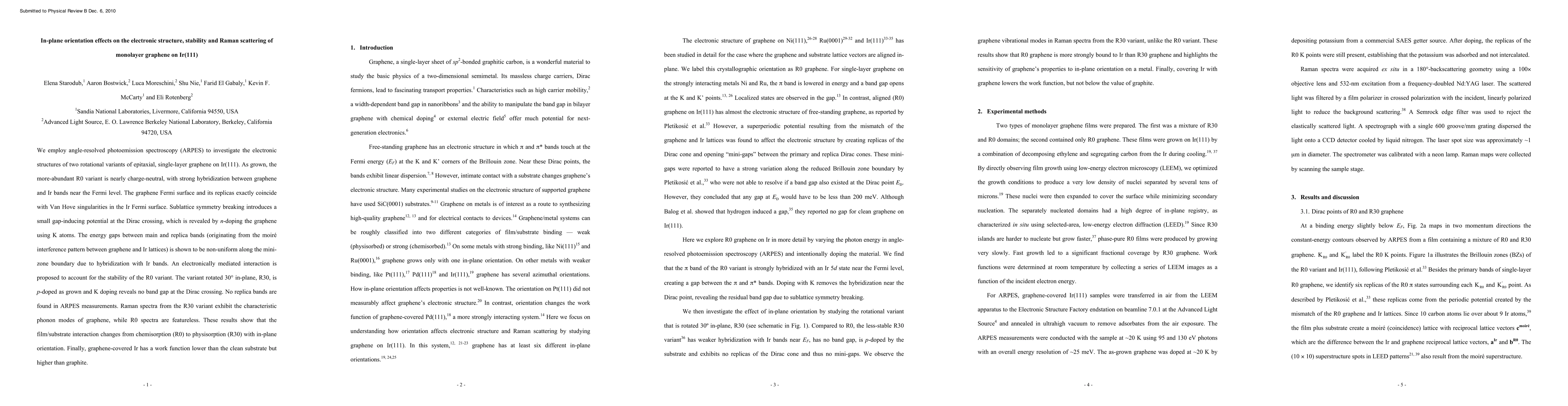 We employ angle-resolved photoemission spectroscopy (ARPES) to investigate the electronic structures of two rotational variants of epitaxial, single-layer graphene on Ir(111). As grown, the more-abundant R0 variant is nearly charge-neutral, with strong hybridization between graphene and Ir bands near the Fermi level. The graphene Fermi surface and its replicas exactly coincide with Van Hove singularities in the Ir Fermi surface. Sublattice symmetry breaking introduces a small gap-inducing potential at the Dirac crossing, which is revealed by n-doping the graphene using K atoms. The energy gaps between main and replica bands (originating from the moir\'e interference pattern between graphene and Ir lattices) is shown to be non-uniform along the mini- zone boundary due to hybridization with Ir bands. An electronically mediated interaction is proposed to account for the stability of the R0 variant. The variant rotated 30{\deg} in-plane, R30, is p-doped as grown and K doping reveals no band gap at the Dirac crossing. No replica bands are found in ARPES measurements. Raman spectra from the R30 variant exhibit the characteristic phonon modes of graphene, while R0 spectra are featureless. These results show that the film/substrate interaction changes from chemisorption (R0) to physisorption (R30) with in-plane orientation. Finally, graphene-covered Ir has a work function lower than the clean substrate but higher than graphite.