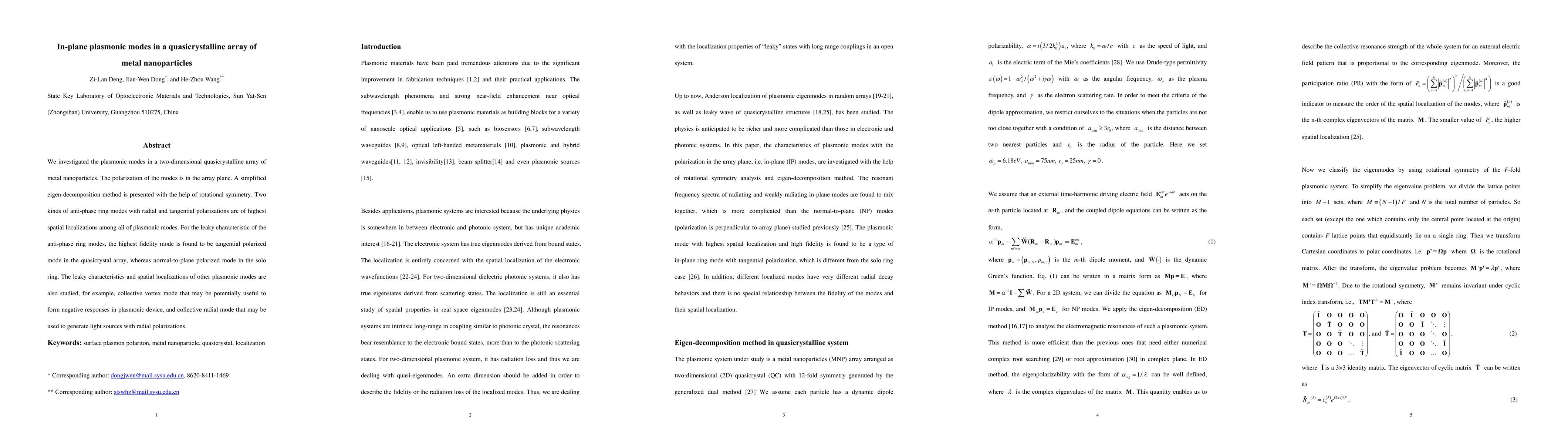 This paper explores plasmonic modes in a quasicrystalline array of metal nanoparticles, focusing on in-plane polarization. It identifies two highly localized anti-phase ring modes with tangential and radial polarizations, with the tangential mode exhibiting superior leaky characteristics in the quasicrystal array.