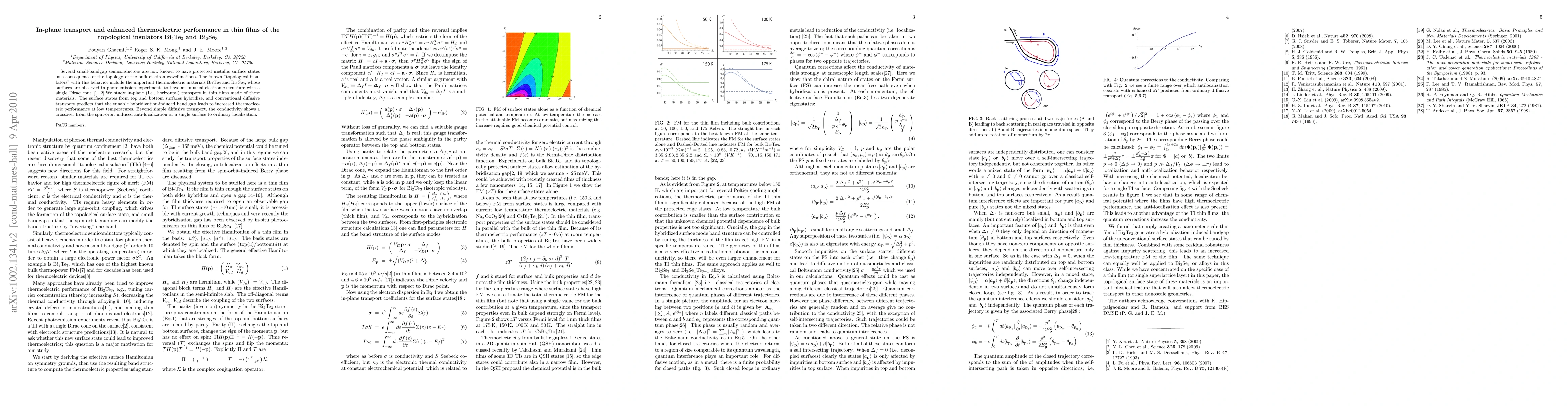 This paper investigates in-plane transport in thin films of topological insulators Bi_2Te_3 and Bi_2Se_3, finding that hybridization of surface states enhances thermoelectric performance at low temperatures. The study reveals a transition from spin-orbit induced anti-localization to ordinary localization in conductivity.