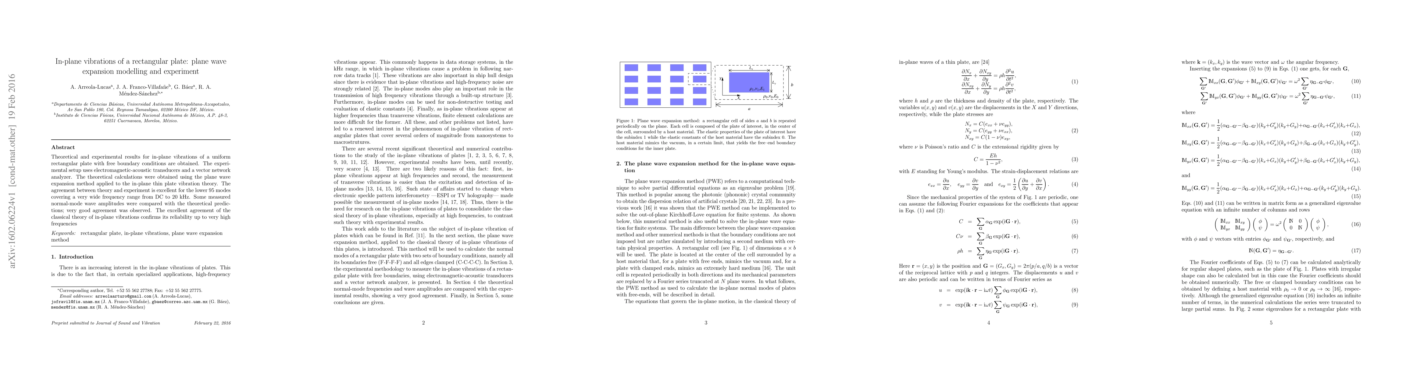 This paper presents theoretical and experimental results for in-plane vibrations of a rectangular plate using the plane wave expansion method, showing excellent agreement for lower modes up to 20 kHz. Experimental validation uses electromagnetic-acoustic transducers, confirming the reliability of classical theory at high frequencies.