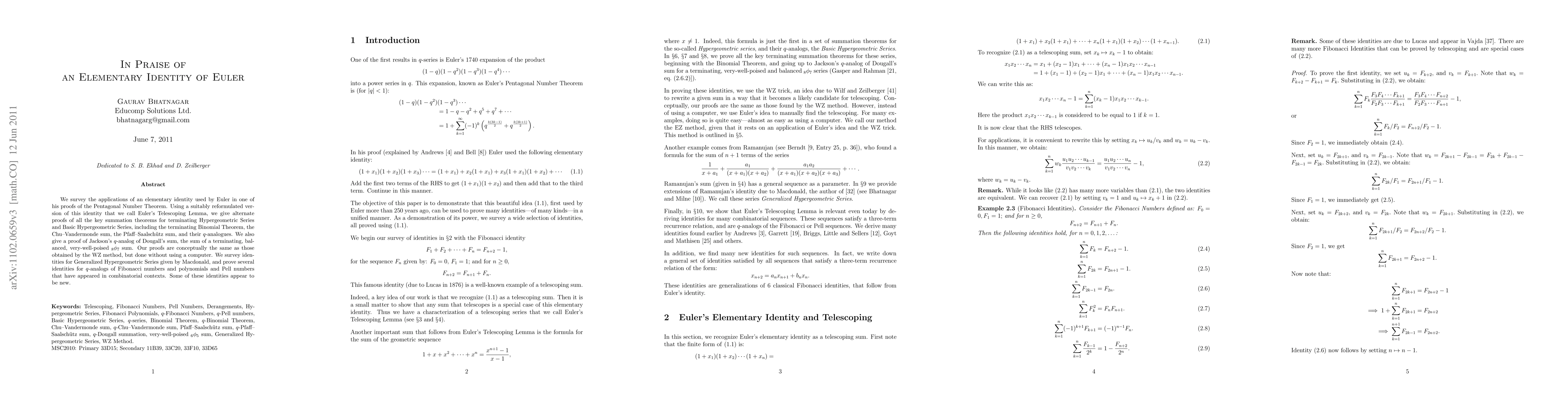 We survey the applications of an elementary identity used by Euler in one of his proofs of the Pentagonal Number Theorem. Using a suitably reformulated version of this identity that we call Euler's Telescoping Lemma, we give alternate proofs of all the key summation theorems for terminating Hypergeometric Series and Basic Hypergeometric Series, including the terminating Binomial Theorem, the Chu--Vandermonde sum, the Pfaff--Saalch\" utz sum, and their $q$-analogues. We also give a proof of Jackson's $q$-analog of Dougall's sum, the sum of a terminating, balanced, very-well-poised $_8\phi_7$ sum. Our proofs are conceptually the same as those obtained by the WZ method, but done without using a computer. We survey identities for Generalized Hypergeometric Series given by Macdonald, and prove several identities for $q$-analogs of Fibonacci numbers and polynomials and Pell numbers that have appeared in combinatorial contexts. Some of these identities appear to be new.