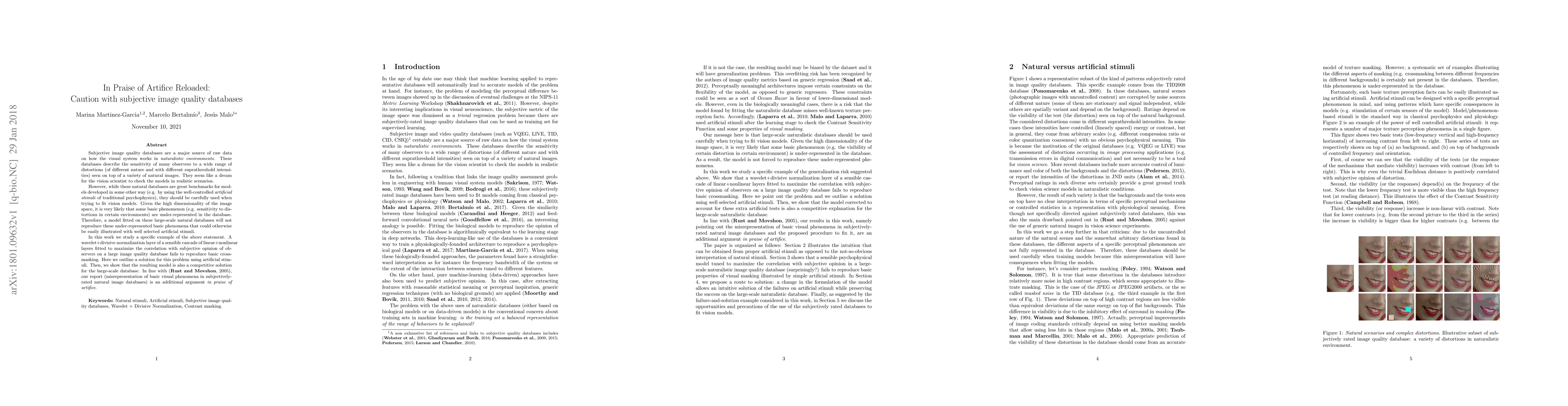 This paper highlights the limitations of using subjective image quality databases for fitting vision models, as they may under-represent certain basic visual phenomena. The authors demonstrate this issue with a wavelet+divisive normalization layer model failing to reproduce crossmasking effects. They propose a solution using artificial stimuli, resulting in a competitive model for large-scale databases, emphasizing the value of controlled, artificial stimuli in vision research.
