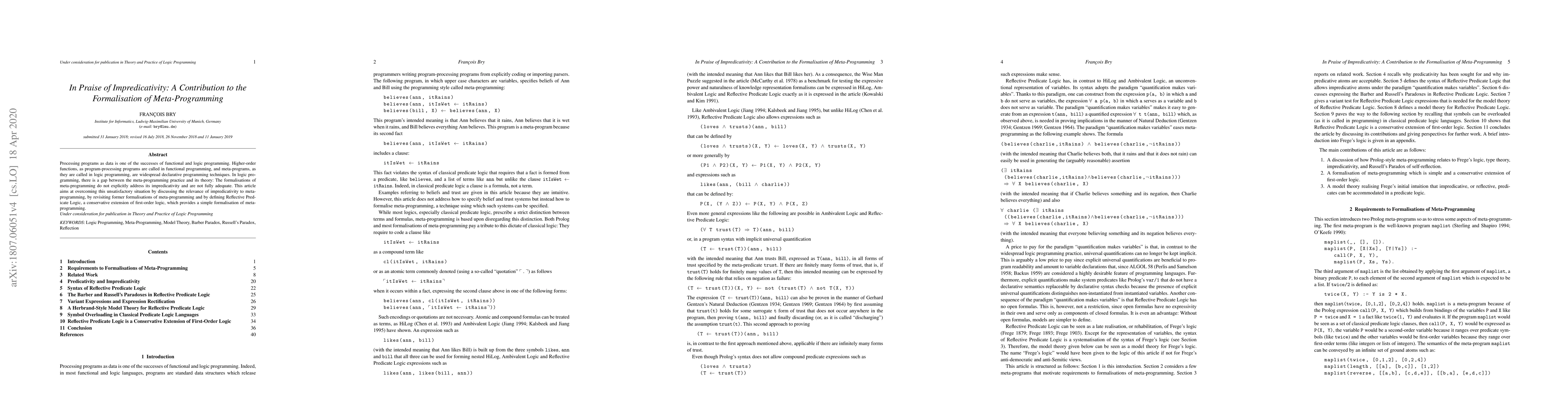 Processing programs as data is one of the successes of functional and logic programming. Higher-order functions, as program-processing programs are called in functional programming, and meta-programs, as they are called in logic programming, are widespread declarative programming techniques. In logic programming, there is a gap between the meta-programming practice and its theory: The formalisations of meta-programming do not explicitly address its impredicativity and are not fully adequate. This article aims at overcoming this unsatisfactory situation by discussing the relevance of impredicativity to meta-programming, by revisiting former formalisations of meta-programming and by defining Reflective Predicate Logic, a conservative extension of first-order logic, which provides a simple formalisation of meta-programming.