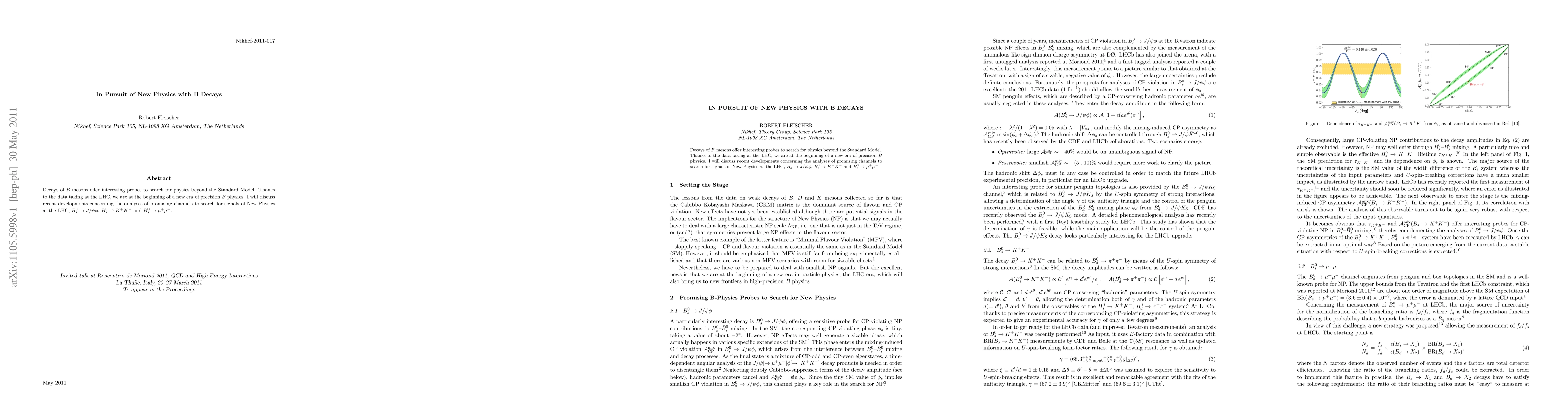 This paper explores B meson decays as potential probes for physics beyond the Standard Model, highlighting recent analyses of channels like B^0_s -> J/psi phi, B^0_s -> K^+K^-, and B^0_s -> mu^+ mu^- to detect signals of New Physics from LHC data.