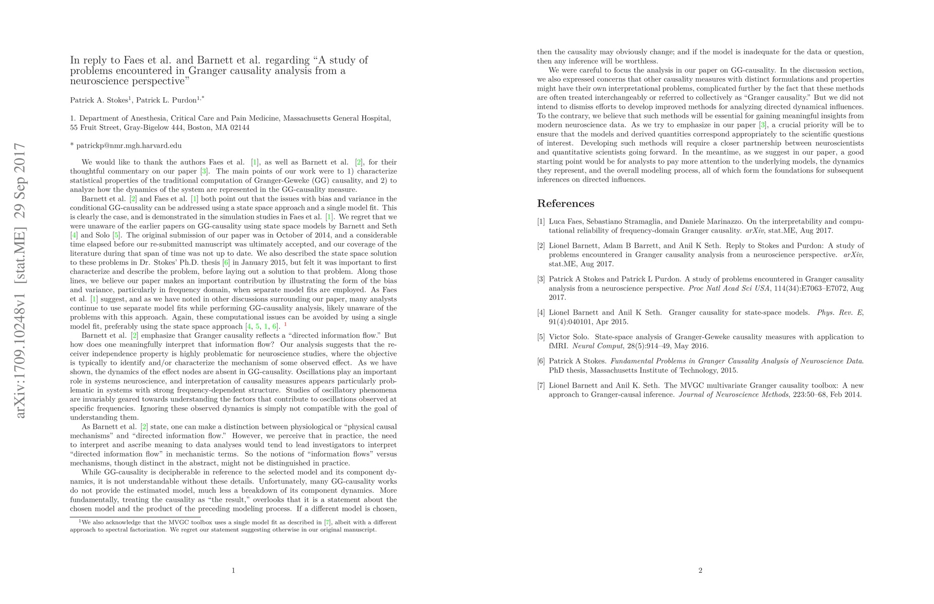 This reply is in response to commentaries by Barnett, Barrett, and Seth (arXiv:1708.08001) and Faes, Stramaglia, and Marinazzo (arXiv:1708.06990) on our paper entitled "A study of problems encountered in Granger causality analysis from a neuroscience perspective." (PNAS 114(34):7063-7072. 2017). In our paper, we analyzed several properties of Granger-Geweke causality (GGC) and discussed potential problems in neuroscience applications. We demonstrated: (i) that GGC, estimated using separate model fits, is either severely biased, particularly when the true model is known, or a high variance is introduced to overcome the bias; and (ii) that GGC does not reflect some component dynamics of the system. The commentaries by both Faes et al. and Barnett et al. point out that the computational problems of (i) are resolved by using recent computational methods. We acknowledge that these problems are indeed resolved by these methods. However, the traditional computation using separate model fits continues to be presented and applied. More fundamentally, the interpretational problems stemming from (ii) are not in anyway addressed by the improved methods because they are inherent to the definition of GGC. These properties are indeed acknowledged by both commentaries. We have no misconception of the GGC measure and do not claim that these properties are facially wrong. But we do discuss at length how these properties make it inappropriate and misleading for common types of scientific questions, how presentation of GGC results without model estimates are not decipherable, and how the absence of clear statements of questions of interest present further opportunities for misinterpretation.