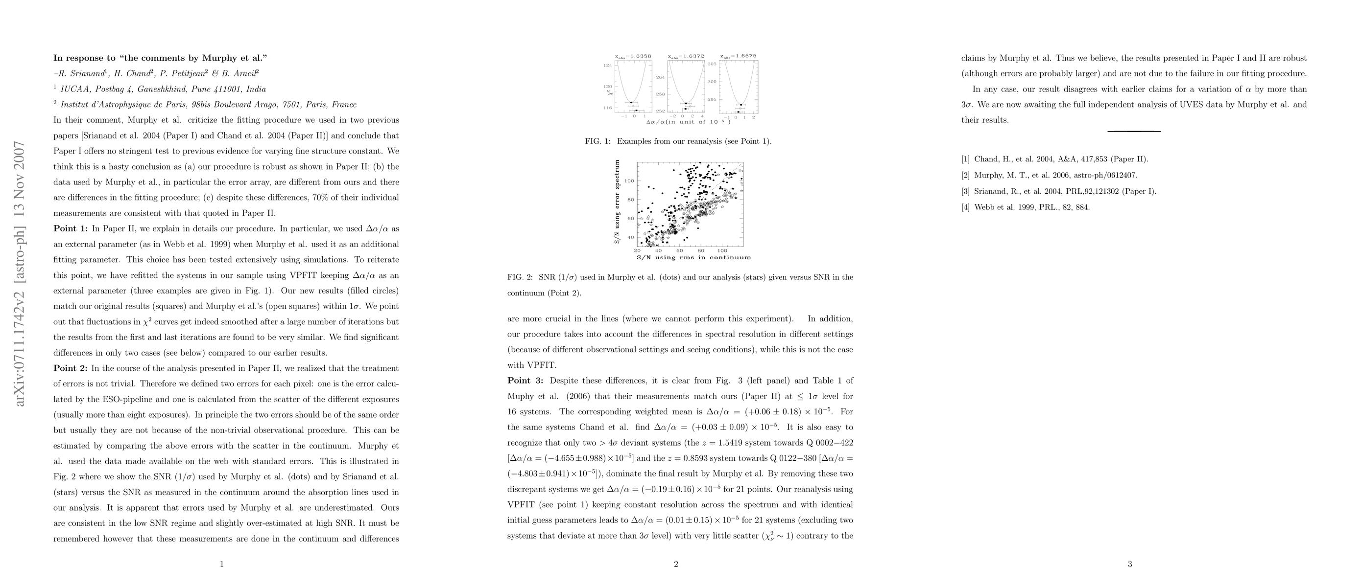 In their comment, Murphy et al. (arxiv:0708.3677) criticize the fitting procedure we used in two previous papers [Srianand et al. 2004(Paper I) and Chand et al. 2004 (Paper II)] and conclude that the above papers offers no stringent test to previous evidence for varying fine structure constant. We think this is a hasty conclusion as (a) our procedure is robust as shown in Paper II; (b) the data used by Murphy et al., in particular the error array, are different from ours and there are differences in the fitting procedure; (c) despite these differences, 70 per cent of their individual measurements are consistent with that quoted in Paper II. Our reanalysis using VPFIT with identical initial guess parameters leads to \Delta\alpha/\alpha = (0.01+/-0.15)x 10^{-5}$ for 21 systems (excluding two systems that deviate at more than 3$\sigma$ level) with very little scatter (\chi^2_\nu ~1).