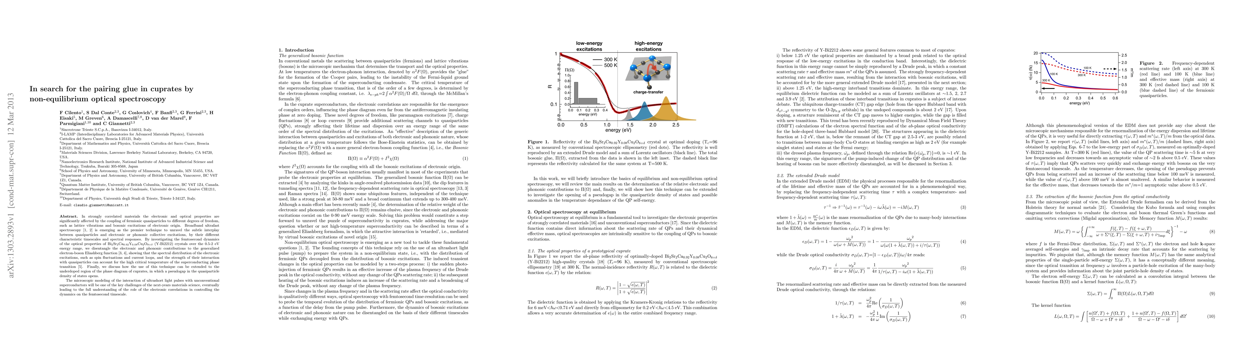 In strongly correlated materials the electronic and optical properties are significantly affected by the coupling of fermionic quasiparticles to different degrees of freedom, such as lattice vibrations and bosonic excitations of electronic origin. Broadband ultrafast spectroscopy is emerging as the premier technique to unravel the subtle interplay between quasiparticles and electronic or phononic collective excitations, by their different characteristic timescales and spectral responses. By investigating the femtosecond dynamics of the optical properties of Y-Bi2212 crystals over the 0.5-2 eV energy range, we disentangle the electronic and phononic contributions to the generalized electron-boson Eliashberg function, showing that the spectral distribution of the electronic excitations, such as spin fluctuations and current loops, and the strength of their interaction with quasiparticles can account for the high critical temperature of the superconducting phase transition. Finally, we discuss how the use of this technique can be extended to the underdoped region of the phase diagram of cuprates, in which a pseudogap in the quasiparticle density of states opens. The microscopic modeling of the interaction of ultrashort light pulses with unconventional superconductors will be one of the key challenges of the next-years materials science, eventually leading to the full understanding of the role of the electronic correlations in controlling the dynamics on the femtosecond timescale.