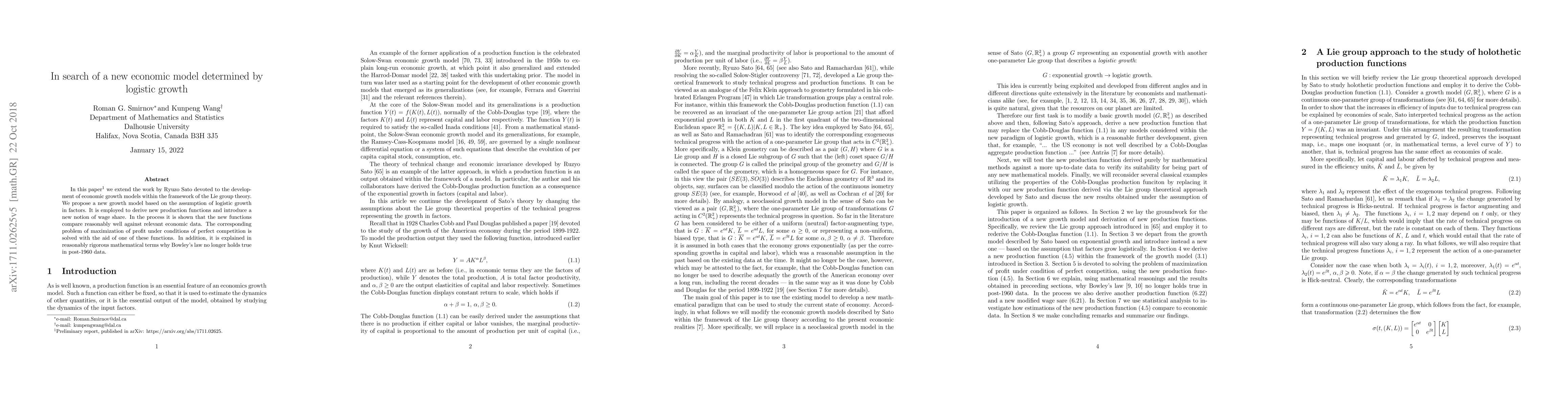 In this paper we extend the work by Ryuzo Sato devoted to the development of economic growth models within the framework of the Lie group theory. We propose a new growth model based on the assumption of logistic growth in factors. It is employed to derive new production functions and introduce a new notion of wage share. In the process it is shown that the new functions compare reasonably well against relevant economic data. The corresponding problem of maximization of profit under conditions of perfect competition is solved with the aid of one of these functions. In addition, it is explained in reasonably rigorous mathematical terms why Bowley's law no longer holds true in post-1960 data.