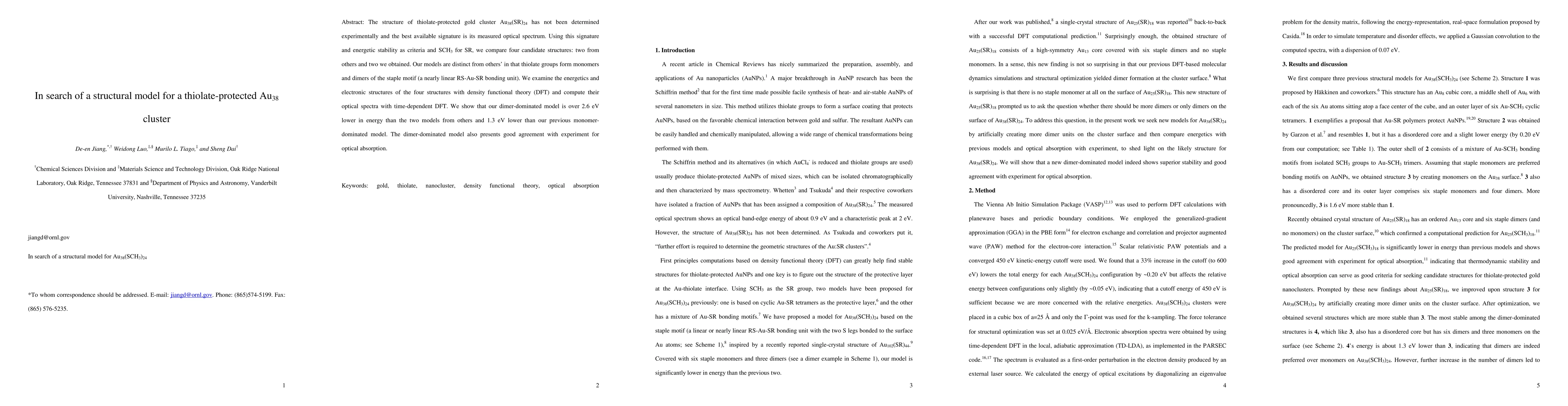 The structure of thiolate-protected gold cluster Au38(SR)24 has not been determined experimentally and the best available signature is its measured optical spectrum. Using this signature and energetic stability as criteria and SCH3 for SR, we compare four candidate structures: two from others and two we obtained. Our models are distinct from others in that thiolate groups form monomers and dimers of the staple motif (a nearly linear RS-Au-SR bonding unit). We examine the energetics and electronic structures of the four structures with density functional theory (DFT) and compute their optical spectra with time-dependent DFT. We show that our dimer-dominated model is over 2.6 eV lower in energy than the two models from others and 1.3 eV lower than our previous monomer-dominated model. The dimer-dominated model also presents good agreement with experiment for optical absorption.