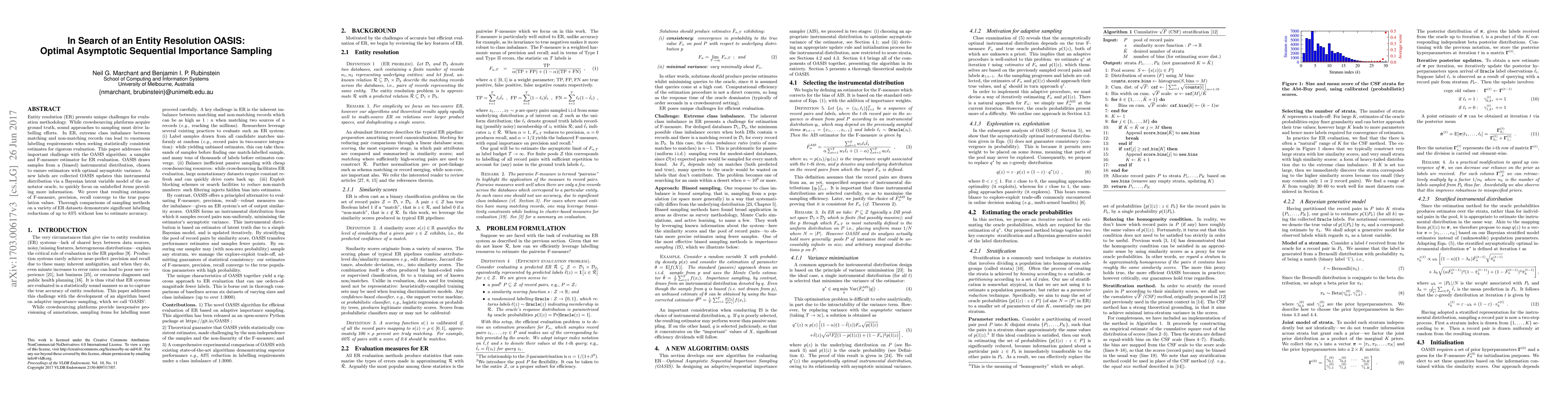 Entity resolution (ER) presents unique challenges for evaluation methodology. While crowdsourcing platforms acquire ground truth, sound approaches to sampling must drive labelling efforts. In ER, extreme class imbalance between matching and non-matching records can lead to enormous labelling requirements when seeking statistically consistent estimates for rigorous evaluation. This paper addresses this important challenge with the OASIS algorithm: a sampler and F-measure estimator for ER evaluation. OASIS draws samples from a (biased) instrumental distribution, chosen to ensure estimators with optimal asymptotic variance. As new labels are collected OASIS updates this instrumental distribution via a Bayesian latent variable model of the annotator oracle, to quickly focus on unlabelled items providing more information. We prove that resulting estimates of F-measure, precision, recall converge to the true population values. Thorough comparisons of sampling methods on a variety of ER datasets demonstrate significant labelling reductions of up to 83% without loss to estimate accuracy.