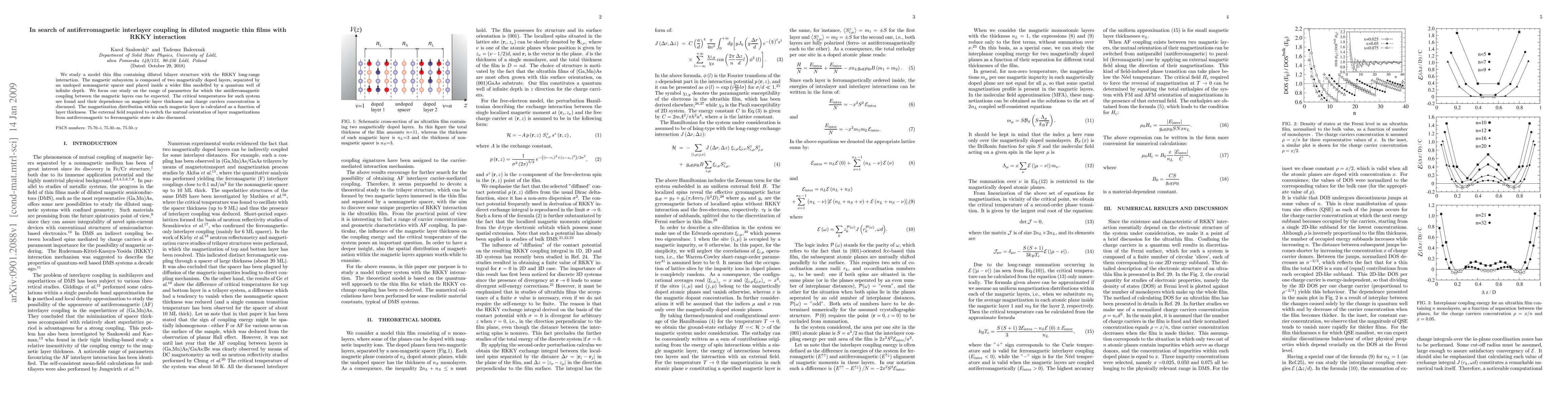 Researchers investigated antiferromagnetic interlayer coupling in diluted magnetic thin films with RKKY interaction, finding critical temperatures that depend on layer thickness and charge carrier concentration.