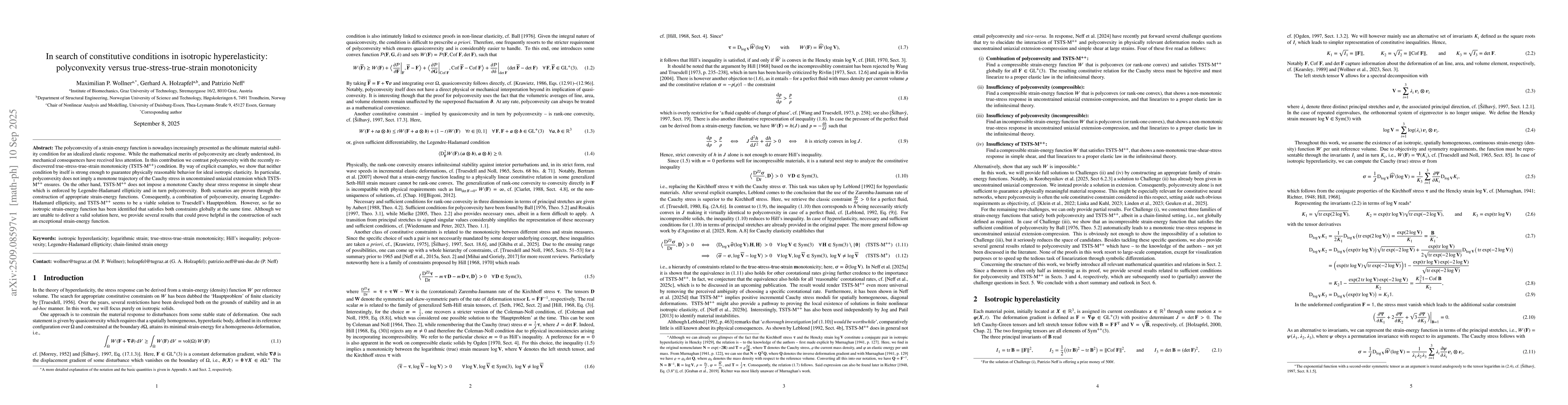 The polyconvexity of a strain-energy function is nowadays increasingly presented as the ultimate material stability condition for an idealized elastic response. While the mathematical merits of polyconvexity are clearly understood, its mechanical consequences have received less attention. In this contribution we contrast polyconvexity with the recently rediscovered true-stress-true-strain monotonicity (TSTS-M${}^{++}\!$) condition. By way of explicit examples, we show that neither condition by itself is strong enough to guarantee physically reasonable behavior for ideal isotropic elasticity. In particular, polyconvexity does not imply a monotone trajectory of the Cauchy stress in unconstrained uniaxial extension which TSTS-M${}^{++}\!$ ensures. On the other hand, TSTS-M${}^{++}\!$ does not impose a monotone Cauchy shear stress response in simple shear which is enforced by Legendre-Hadamard ellipticity and in turn polyconvexity. Both scenarios are proven through the construction of appropriate strain-energy functions. Consequently, a combination of polyconvexity, ensuring Legendre-Hadamard ellipticity, and TSTS-M${}^{++}\!$ seems to be a viable solution to Truesdell's Hauptproblem. However, so far no isotropic strain-energy function has been identified that satisfies both constraints globally at the same time. Although we are unable to deliver a valid solution here, we provide several results that could prove helpful in the construction of such an exceptional strain-energy function.
