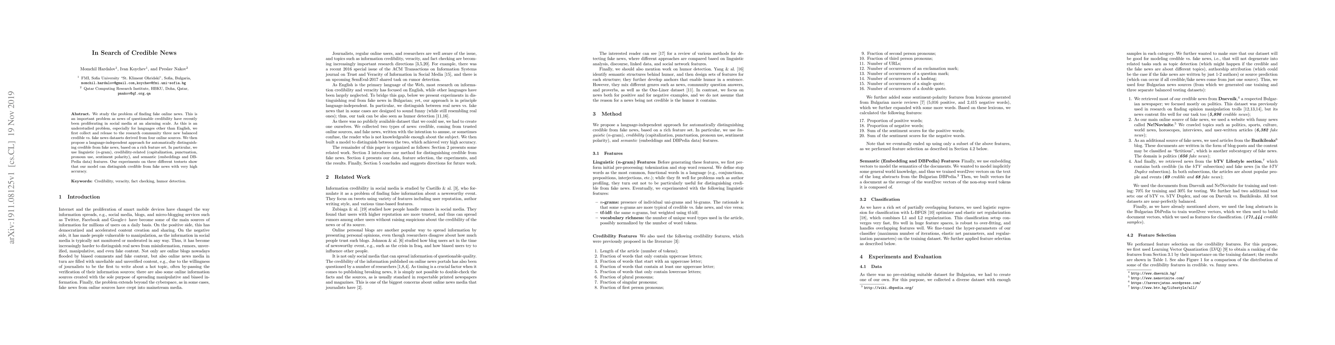 The paper investigates detecting fake news online, addressing the challenge in non-English languages by releasing three new credible vs. fake news datasets. It proposes a language-independent model employing linguistic, credibility-related, and semantic features to distinguish credible from fake news, achieving high accuracy in experiments.