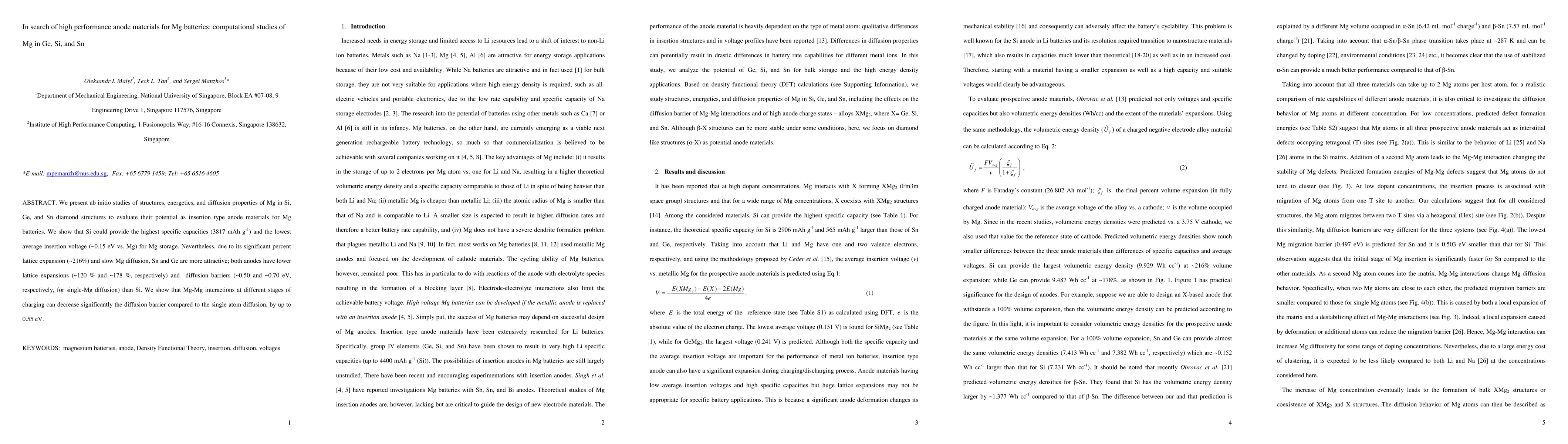 This study evaluates Mg insertion in Si, Ge, and Sn for Mg battery anodes using computational methods, finding Si offers the highest capacity but suffers from significant lattice expansion and slow Mg diffusion. Sn and Ge present lower expansions and lower diffusion barriers, making them more practical despite lower capacities.