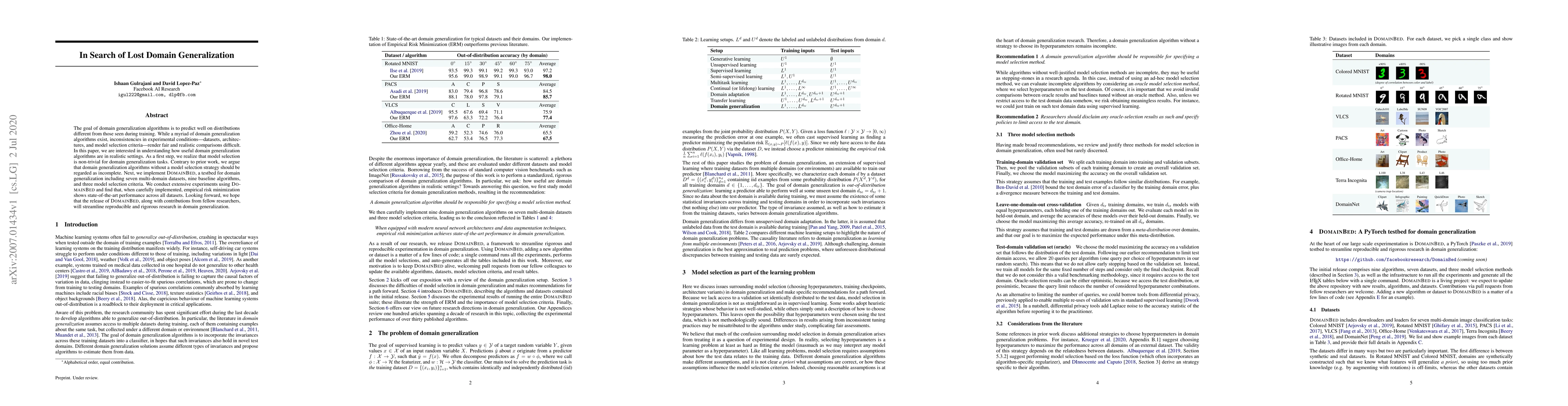 The goal of domain generalization algorithms is to predict well on distributions different from those seen during training. While a myriad of domain generalization algorithms exist, inconsistencies in experimental conditions -- datasets, architectures, and model selection criteria -- render fair and realistic comparisons difficult. In this paper, we are interested in understanding how useful domain generalization algorithms are in realistic settings. As a first step, we realize that model selection is non-trivial for domain generalization tasks. Contrary to prior work, we argue that domain generalization algorithms without a model selection strategy should be regarded as incomplete. Next, we implement DomainBed, a testbed for domain generalization including seven multi-domain datasets, nine baseline algorithms, and three model selection criteria. We conduct extensive experiments using DomainBed and find that, when carefully implemented, empirical risk minimization shows state-of-the-art performance across all datasets. Looking forward, we hope that the release of DomainBed, along with contributions from fellow researchers, will streamline reproducible and rigorous research in domain generalization.