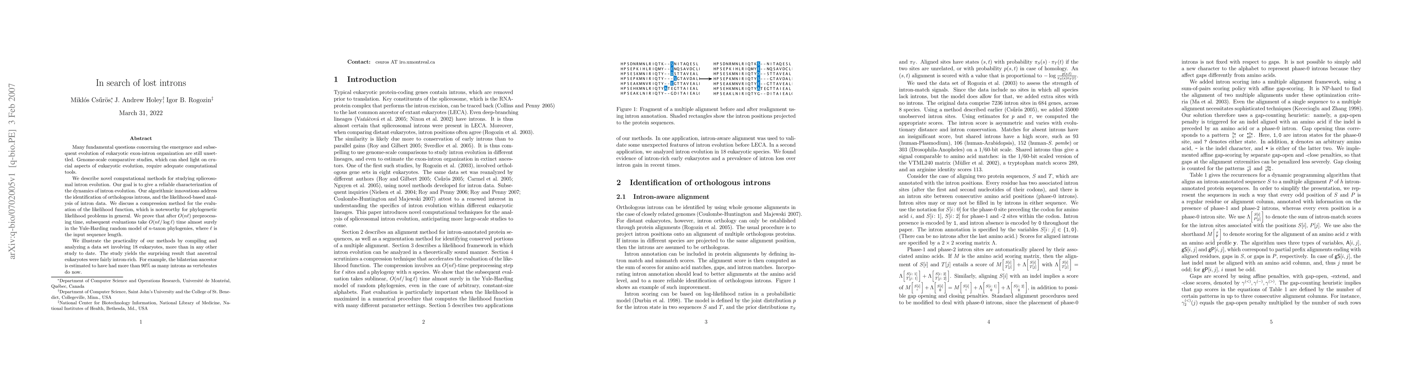 Many fundamental questions concerning the emergence and subsequent evolution of eukaryotic exon-intron organization are still unsettled. Genome-scale comparative studies, which can shed light on crucial aspects of eukaryotic evolution, require adequate computational tools. We describe novel computational methods for studying spliceosomal intron evolution. Our goal is to give a reliable characterization of the dynamics of intron evolution. Our algorithmic innovations address the identification of orthologous introns, and the likelihood-based analysis of intron data. We discuss a compression method for the evaluation of the likelihood function, which is noteworthy for phylogenetic likelihood problems in general. We prove that after $O(nL)$ preprocessing time, subsequent evaluations take $O(nL/\log L)$ time almost surely in the Yule-Harding random model of $n$-taxon phylogenies, where $L$ is the input sequence length. We illustrate the practicality of our methods by compiling and analyzing a data set involving 18 eukaryotes, more than in any other study to date. The study yields the surprising result that ancestral eukaryotes were fairly intron-rich. For example, the bilaterian ancestor is estimated to have had more than 90% as many introns as vertebrates do now.