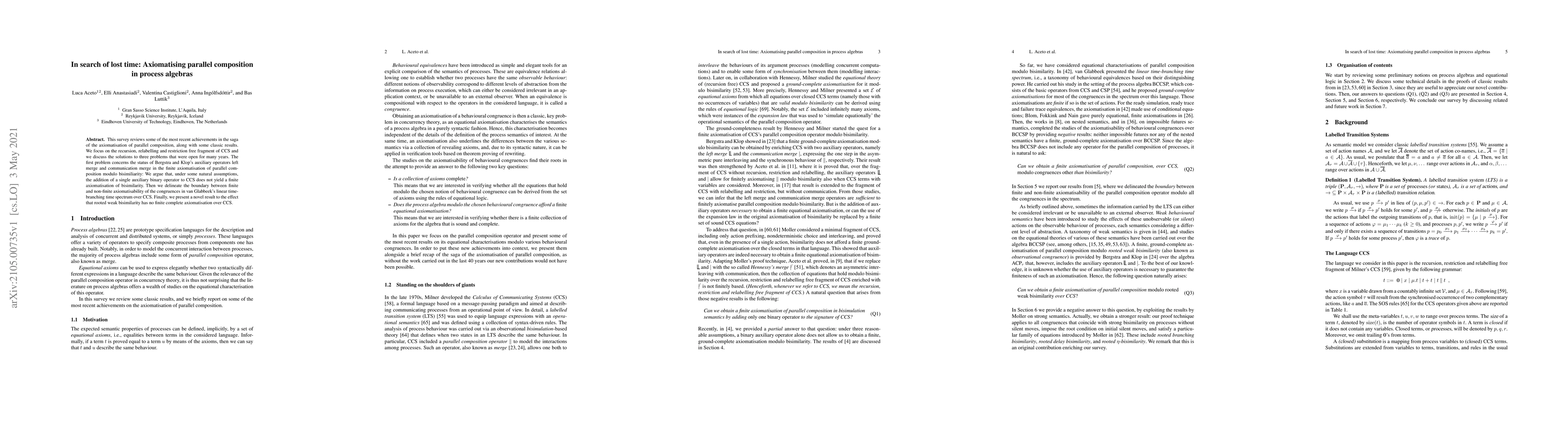 This survey reviews some of the most recent achievements in the saga of the axiomatisation of parallel composition, along with some classic results. We focus on the recursion, relabelling and restriction free fragment of CCS and we discuss the solutions to three problems that were open for many years. The first problem concerns the status of Bergstra and Klop's auxiliary operators left merge and communication merge in the finite axiomatisation of parallel composition modulo bisimiliarity: We argue that, under some natural assumptions, the addition of a single auxiliary binary operator to CCS does not yield a finite axiomatisation of bisimilarity. Then we delineate the boundary between finite and non-finite axiomatisability of the congruences in van Glabbeek's linear time-branching time spectrum over CCS. Finally, we present a novel result to the effect that rooted weak bisimilarity has no finite complete axiomatisation over CCS.