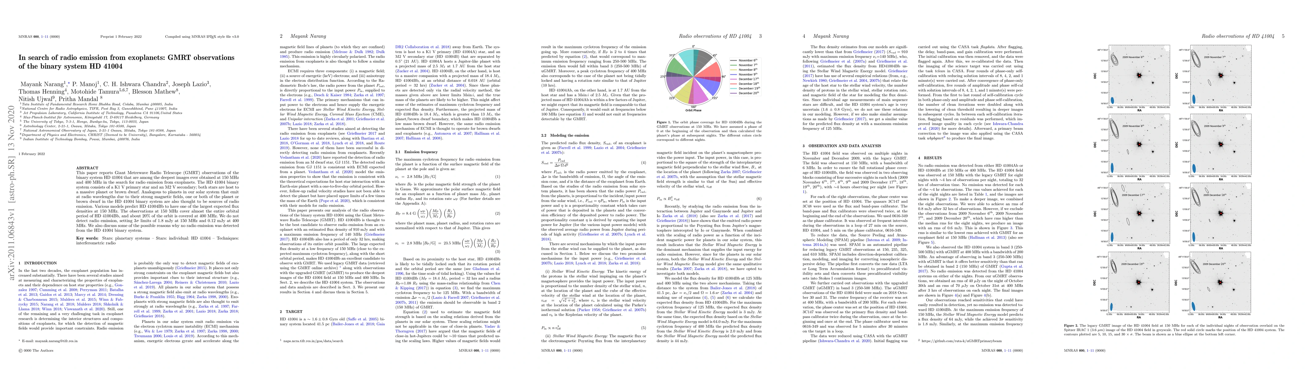 This paper reports deep GMRT observations of the HD 41004 binary system at 150 MHz and 400 MHz, aiming to detect radio emissions from its massive planets or brown dwarfs. No radio emission was detected, setting limits of 1.8 mJy at 150 MHz and 0.12 mJy at 400 MHz, and discusses possible reasons for the absence of detected radio signals.