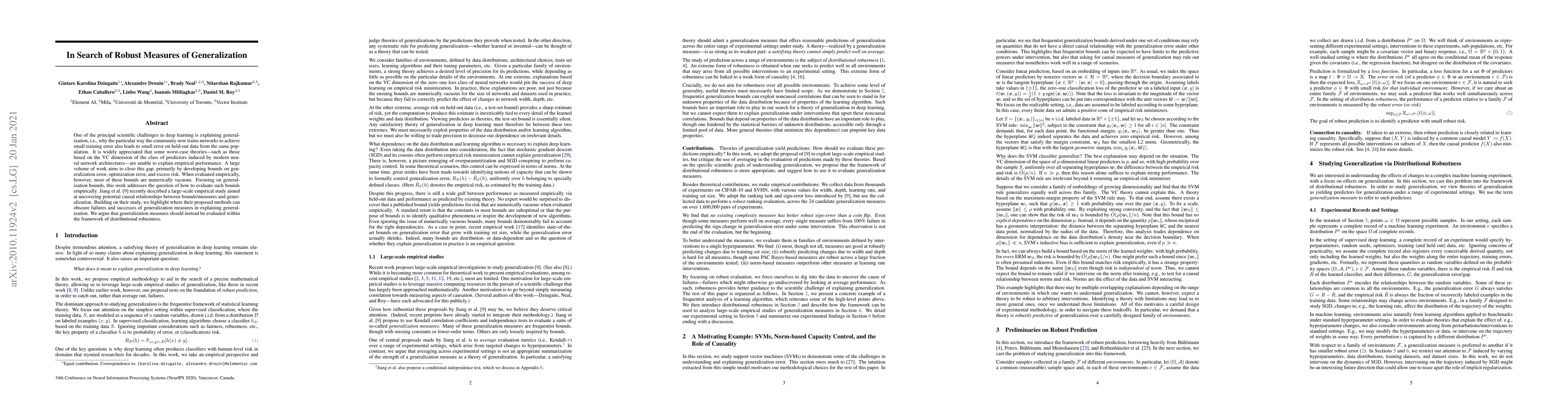 One of the principal scientific challenges in deep learning is explaining generalization, i.e., why the particular way the community now trains networks to achieve small training error also leads to small error on held-out data from the same population. It is widely appreciated that some worst-case theories -- such as those based on the VC dimension of the class of predictors induced by modern neural network architectures -- are unable to explain empirical performance. A large volume of work aims to close this gap, primarily by developing bounds on generalization error, optimization error, and excess risk. When evaluated empirically, however, most of these bounds are numerically vacuous. Focusing on generalization bounds, this work addresses the question of how to evaluate such bounds empirically. Jiang et al. (2020) recently described a large-scale empirical study aimed at uncovering potential causal relationships between bounds/measures and generalization. Building on their study, we highlight where their proposed methods can obscure failures and successes of generalization measures in explaining generalization. We argue that generalization measures should instead be evaluated within the framework of distributional robustness.