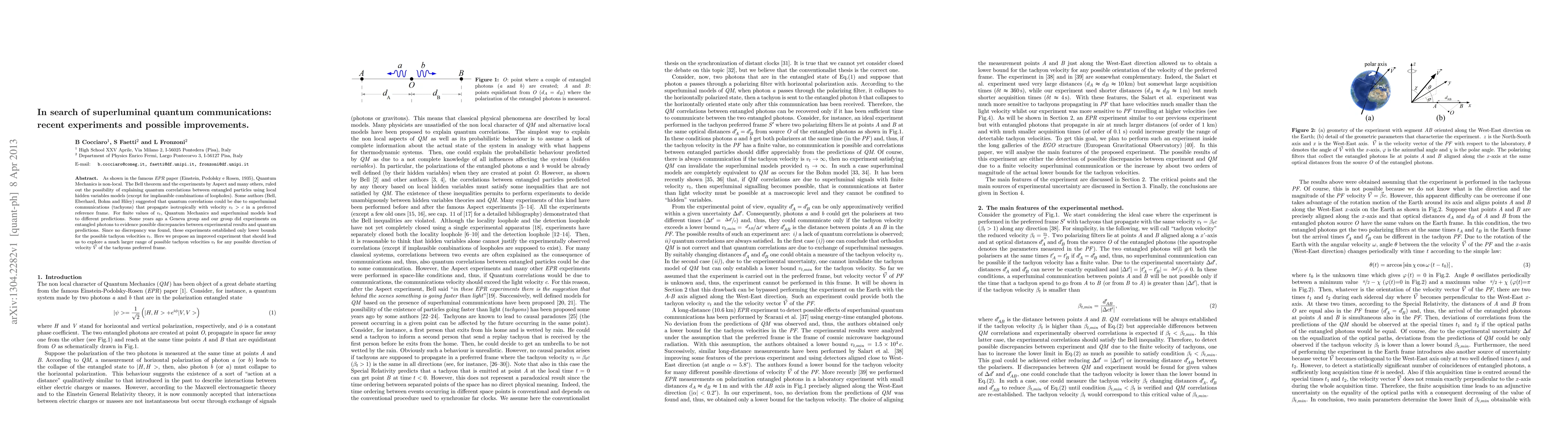 As shown in the famous \emph{EPR} paper (Einstein, Podolsky e Rosen,1935), Quantum Mechanics is non-local. The Bell theorem and the experiments by Aspect and many others, ruled out the possibility of explaining quantum correlations between entangled particles using local hidden variables models (except for implausible combinations of loopholes). Some authors (Bell, Eberhard, Bohm and Hiley) suggested that quantum correlations could be due to superluminal communications (tachyons) that propagate isotropically with velocity \emph{$v_{t}>c$} in a preferred reference frame. For finite values of \emph{$v_{t}$}, Quantum Mechanics and superluminal models lead to different predictions. Some years ago a Geneva group and our group did experiments on entangled photons to evidence possible discrepancies between experimental results and quantum predictions. Since no discrepancy was found, these experiments established only lower bounds for the possible tachyon velocities \emph{$v_{t}$}. Here we propose an improved experiment that should lead us to explore a much larger range of possible tachyon velocities \emph{$v_{t}$} for any possible direction of velocity $\vec{V}$ of the tachyons preferred frame.
