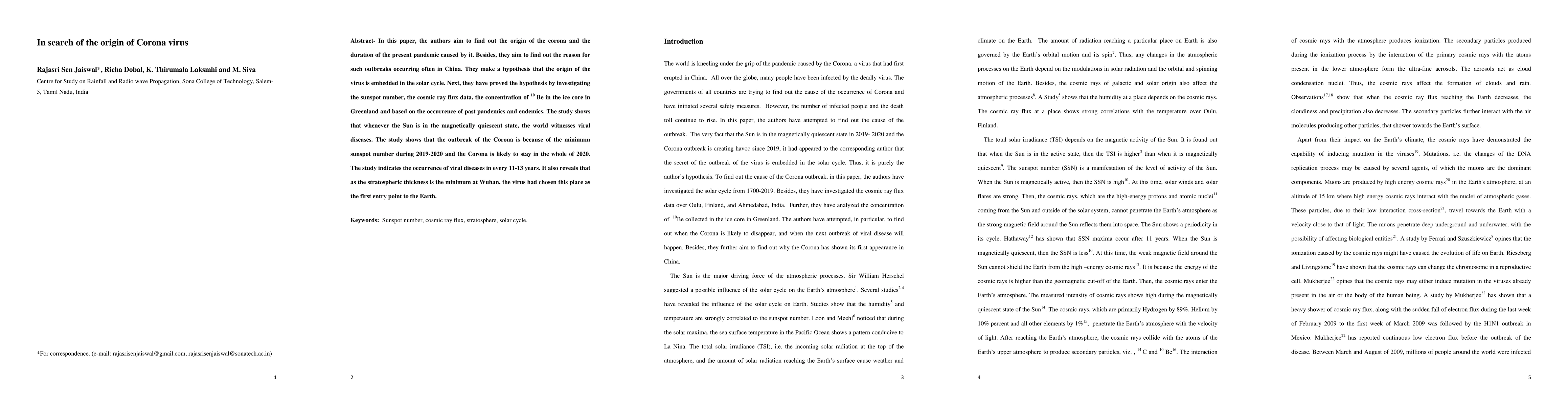 In this paper, the authors aim to find out the origin of the corona and the duration of the present pandemic caused by it. Besides, they aim to find out the reason for such outbreaks occurring often in China. They make a hypothesis that the origin of the virus is embedded in the solar cycle. Next, they have proved the hypothesis by investigating the sunspot number, the cosmic ray flux data, the concentration of 10 Be in the ice core in Greenland and based on the occurrence of past pandemics and endemics. The study shows that whenever the Sun is in the magnetically quiescent state, the world witnesses viral diseases. The study shows that the outbreak of the Corona is because of the minimum sunspot number during 2019-2020 and the Corona is likely to stay in the whole of 2020. The study indicates the occurrence of viral diseases in every 11-13 years. It also reveals that as the stratospheric thickness is the minimum at Wuhan, the virus had chosen this place as the first entry point to the Earth.