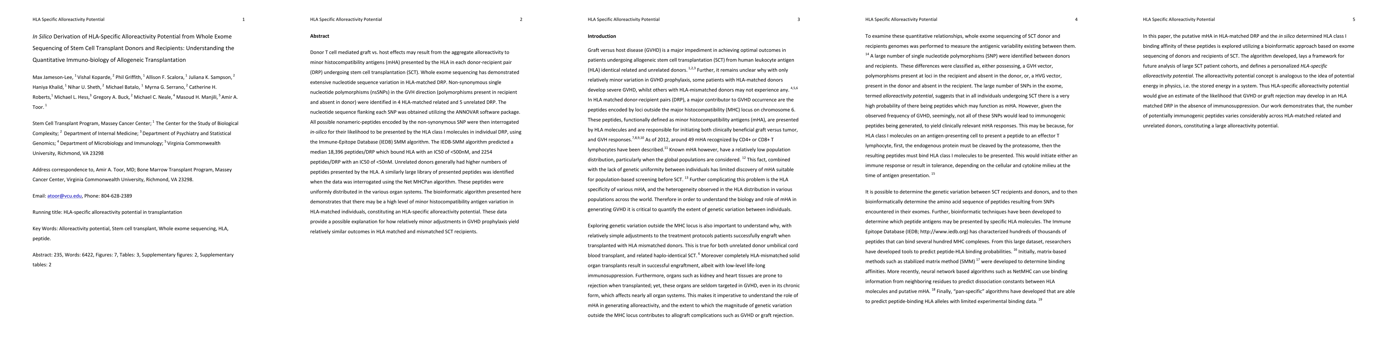 This paper uses whole exome sequencing to identify non-synonymous SNPs in stem cell transplant donor-recipient pairs, predicting potential minor histocompatibility antigens presented by HLA molecules. The study finds a high level of HLA-specific alloreactivity potential, suggesting extensive minor histocompatibility antigen variation even in HLA-matched transplants.
