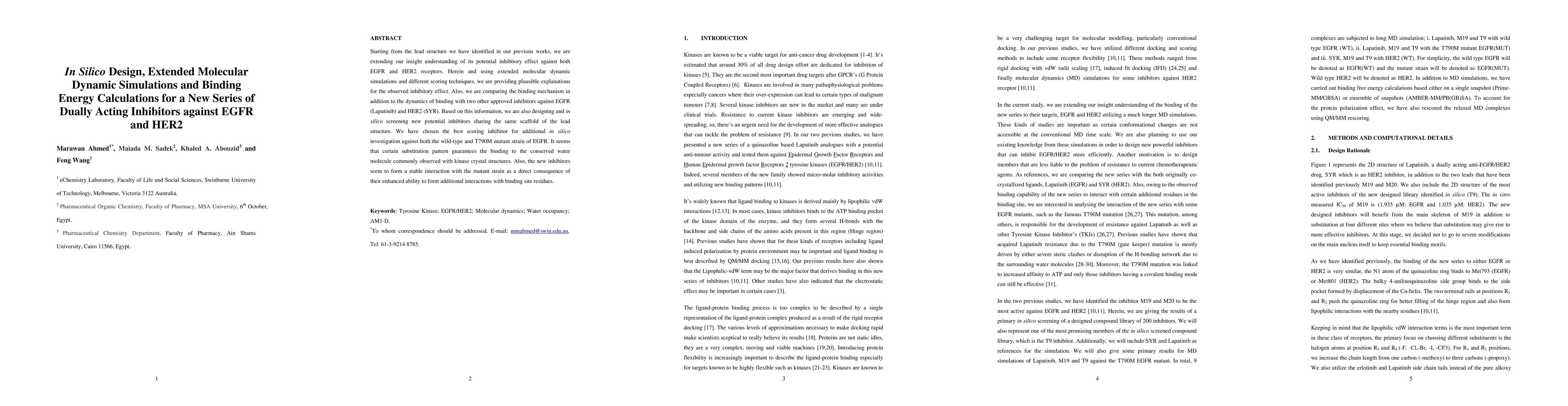 Starting from the lead structure we have identified in our previous works, we are extending our insight understanding of its potential inhibitory effect against both EGFR and HER2 receptors. Herein and using extended molecular dynamic simulations and different scoring techniques, we are providing plausible explanations for the observed inhibitory effect. Also, we are comparing the binding mechanism in addition to the dynamics of binding with two other approved inhibitors against EGFR (Lapatinib) and HER2 (SYR). Based on this information, we are also designing and in silico screening new potential inhibitors sharing the same scaffold of the lead structure. We have chosen the best scoring inhibitor for additional in silico investigation against both the wild-type and T790M mutant strain of EGFR. It seems that certain substitution pattern guarantees the binding to the conserved water molecule commonly observed with kinase crystal structures. Also, the new inhibitors seem to form a stable interaction with the mutant strain as a direct consequence of their enhanced ability to form additional interactions with binding site residues.