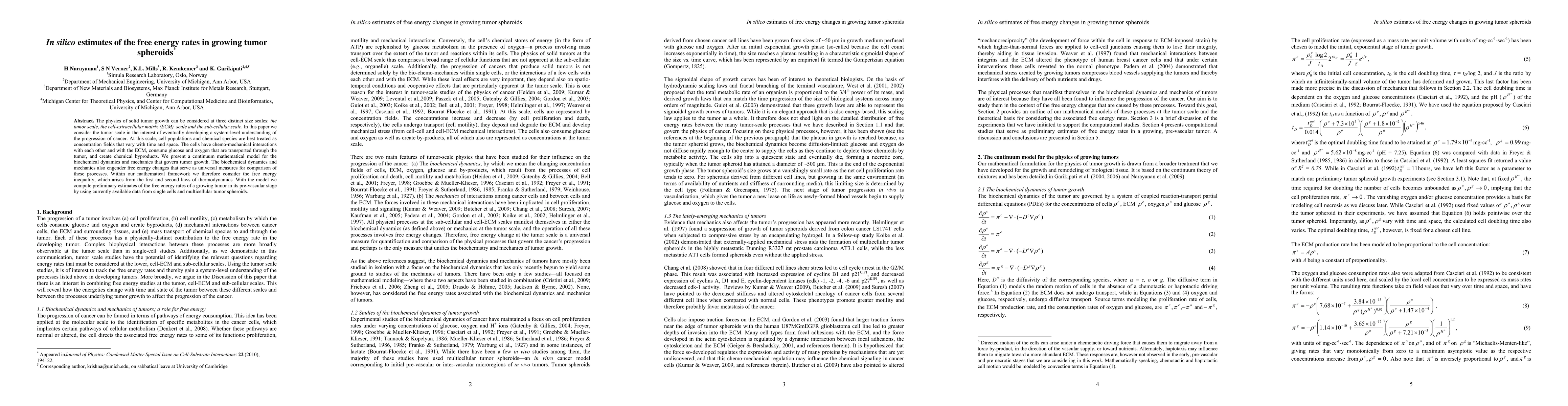 This paper develops a continuum mathematical model to describe the biochemical dynamics and mechanics of tumor growth at the tumor scale, focusing on chemo-mechanical interactions and energy changes. It estimates free energy rates in growing tumor spheroids using thermodynamic principles and available data.
