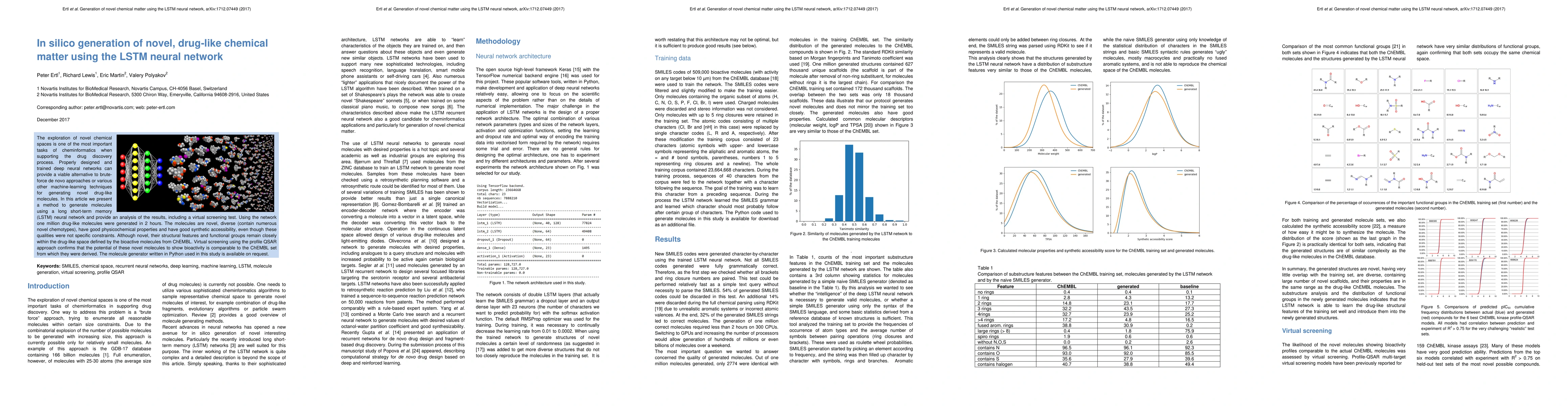 The exploration of novel chemical spaces is one of the most important tasks of cheminformatics when supporting the drug discovery process. Properly designed and trained deep neural networks can provide a viable alternative to brute-force de novo approaches or various other machine-learning techniques for generating novel drug-like molecules. In this article we present a method to generate molecules using a long short-term memory (LSTM) neural network and provide an analysis of the results, including a virtual screening test. Using the network one million drug-like molecules were generated in 2 hours. The molecules are novel, diverse (contain numerous novel chemotypes), have good physicochemical properties and have good synthetic accessibility, even though these qualities were not specific constraints. Although novel, their structural features and functional groups remain closely within the drug-like space defined by the bioactive molecules from ChEMBL. Virtual screening using the profile QSAR approach confirms that the potential of these novel molecules to show bioactivity is comparable to the ChEMBL set from which they were derived. The molecule generator written in Python used in this study is available on request.