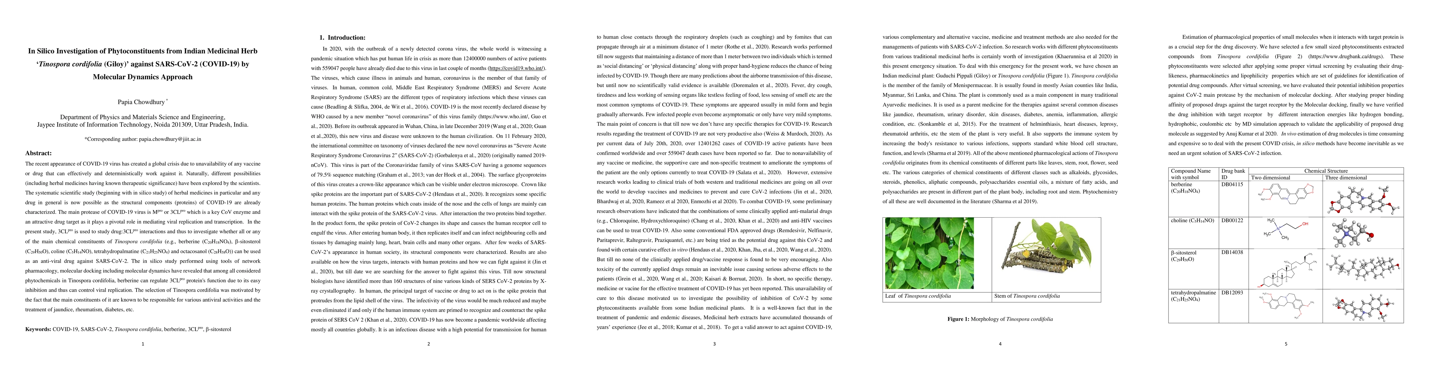This study investigates the potential of phytoconstituents from Tinospora cordifolia (Giloy) against SARS-CoV-2's main protease (3CLpro) using in silico methods. Berberine, a key constituent, was found to effectively inhibit 3CLpro, suggesting its potential as an antiviral drug against COVID-19.