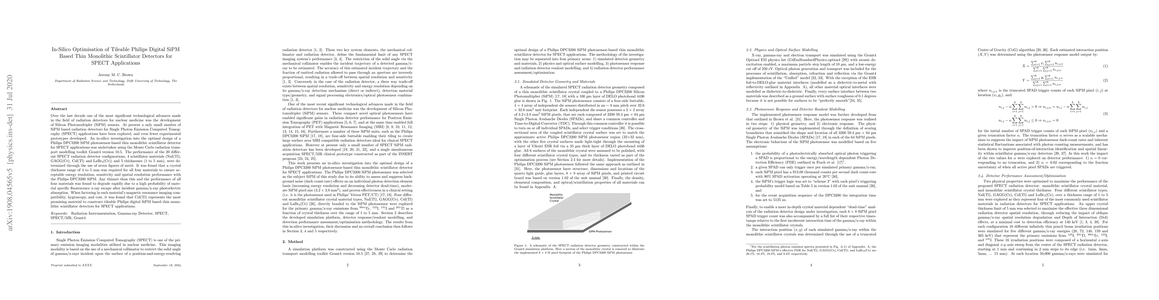 Over the last decade one of the most significant technological advances made in the field of radiation detectors for nuclear medicine was the development of Silicon Photomultipler (SiPM) sensors. At present a only small number of SiPM based radiation detectors for Single Photon Emission Computed Tomography (SPECT) applications have been explored, and even fewer experimental prototypes developed. An in-silico investigation into the optimal design of a Philips DPC3200 SiPM photosensor-based thin monolithic scintillator detector for SPECT applications was undertaken using the Monte Carlo radiation transport modelling toolkit Geant4 version 10.5. The performance of the 20 different SPECT radiation detector configurations, 4 scintillator materials (NaI(Tl), GAGG(Ce), CsI(Tl) and LaBr$_{3}$(Ce)) and 5 thicknesses (1 to 5 mm), were determined through the use of seven figures of merit. It was found that a crystal thickness range of 4 to 5 mm was required for all four materials to ensure acceptable energy resolution, sensitivity and spatial resolution performance with the Philips DPC3200 SiPM. Any thinner than this and the performance of all four materials was found to degrade rapidly due to a high probability of material specific fluorescence x-ray escape after incident gamma/x-ray photoelectric absorption. When factoring in each material's magnetic resonance imaging compatibility, hygroscopy, and cost, it was found that CsI(Tl) represents the most promising material to construct tileable Philips digital SiPM based thin monolithic scintillator detectors for SPECT applications.
